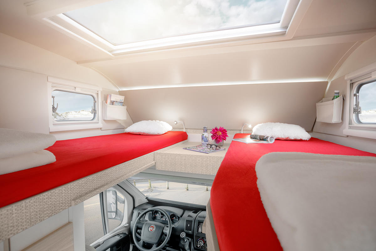 In der Fahrerkabine gibt es neben den komfortablen Sitzen eine Klimaanlage sowie ein Radio mit CD-Player. Zwei weitere Sicherheitsgurte gibt es in der Sitzecke im Heck des Fahrzeugs. Diese dient tagsüber zum gemütlichen Zusammensitzen beim Essen oder Spielen. Abends kann die Sitzecke zum Doppelbett mit den Maßen 2,00 x 1,40m umgebaut werden. Weitere Schlafplätze befinden sich im Alkovenbereich über der Fahrerkabine. Die beiden Einzelbetten eigenen sich perfekt als Schlafplätze fürs Kind.