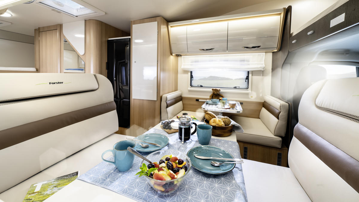 Bei dem F4 Family Plus handelt sich um das Forster A 699 VB Wohnmobil aufgebaut auf einem Fiat. Es ist 6,99m lang, 2,35m breit und hat eine Innenhöhe von von 1,97m, sodass man sich bequem im Wohnraum aufhalten kann.