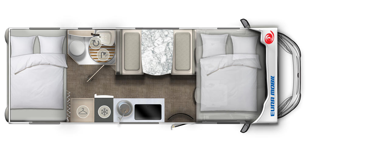 Das Wohnmobil verfügt über zwei Doppelbetten: eins im Alkoven (2,00 x 1,50m) und eins im Heck (1,40 x 2,00m). Ein anderer Schlafplatz entsteht durch das Umbauen der Dinette. Tagsüber kann hier gemütlich zusammen gegessen und gespielt werden. Abends lässt sich hier ein Bett (1,90 x 1,00m) umbauen.