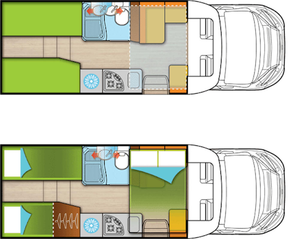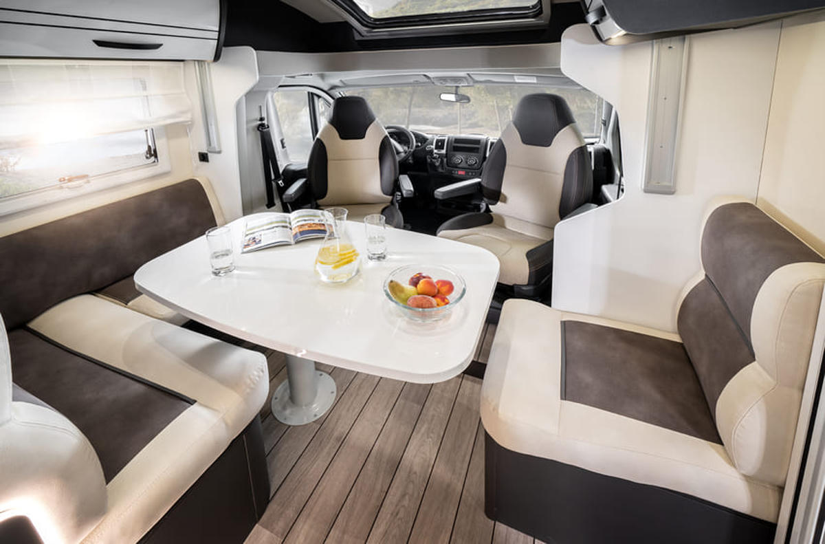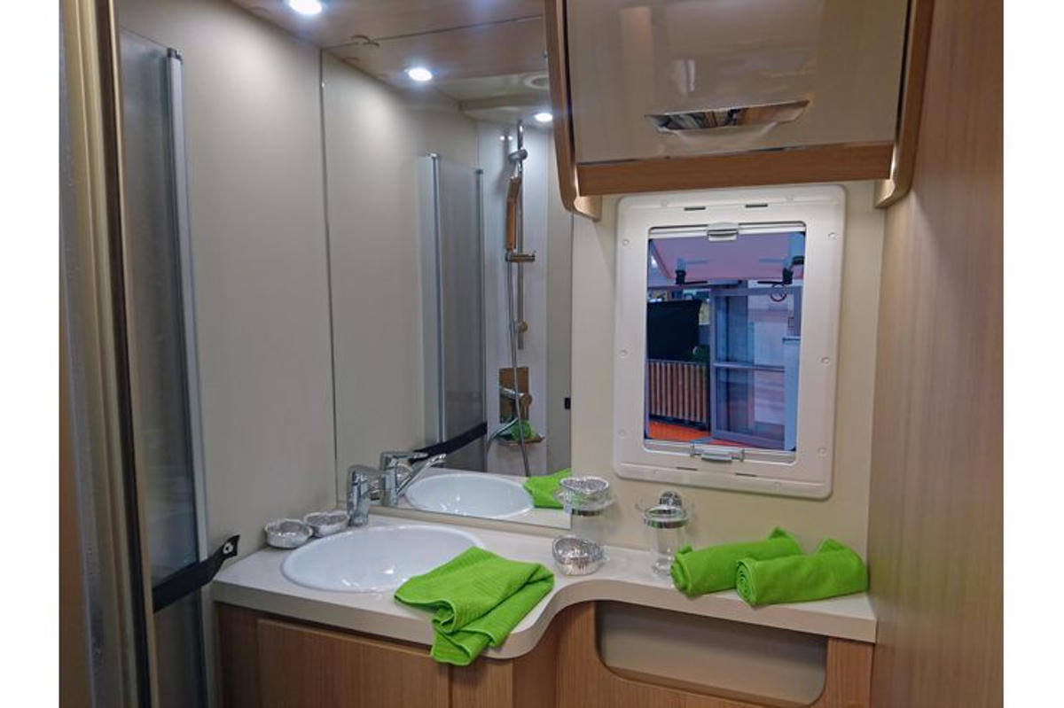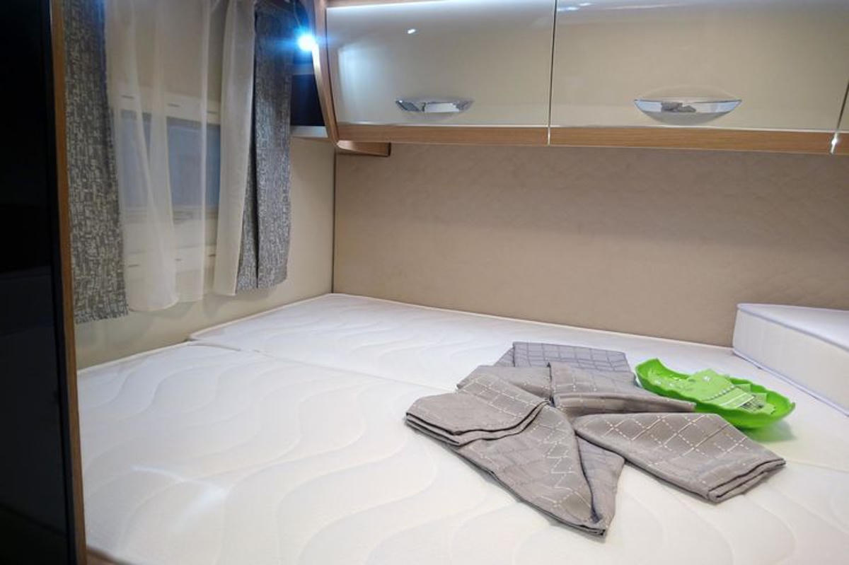 In der Fahrerkabine gibt es drehbare Sitze, sodass durch Rotieren im Nu eine gemütliche Sitzecke entsteht. Über der Sitzecke gibt es ein elektrisches Hub-Einzelbett (1,90 x 0,81). Das feste Bett Doppelbett im Heck misst 2,16 x 1,30m. Unter dem Bett gibt es ein von außen zugängliches Staufach, sodass selbst größere Koffer untergebracht werden können. Die Küche ist neben dem Eingangsbereich eingebaut. Hier gibt es einen großen Kühlschrank mit Gefrierfach, einen Gasherd sowie eine Spüle. Das große Bad verfügt über eine Dusche mit Warmwasser und ein eigenes WC.