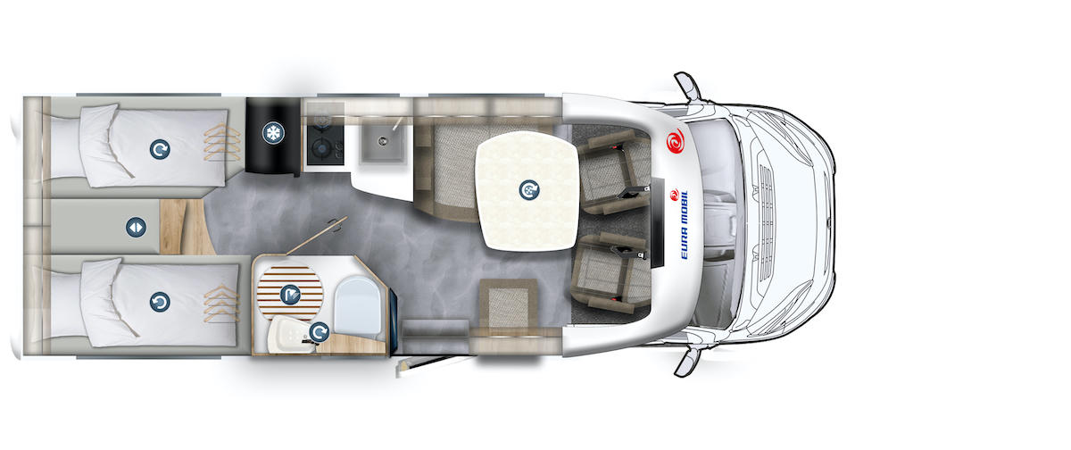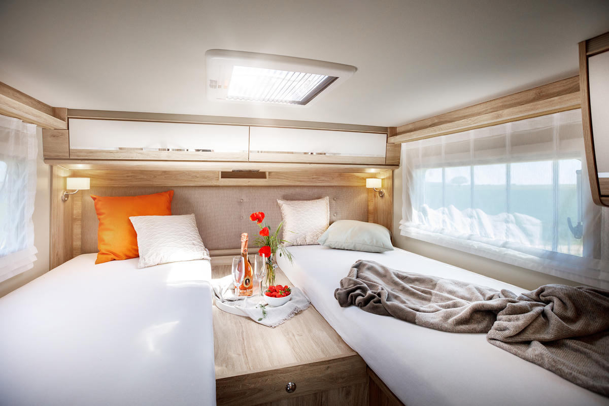 Das 2-Personen Wohnmobil mit komfortablen Einzelbetten im Heck eignet sich ideal für beste Freunde