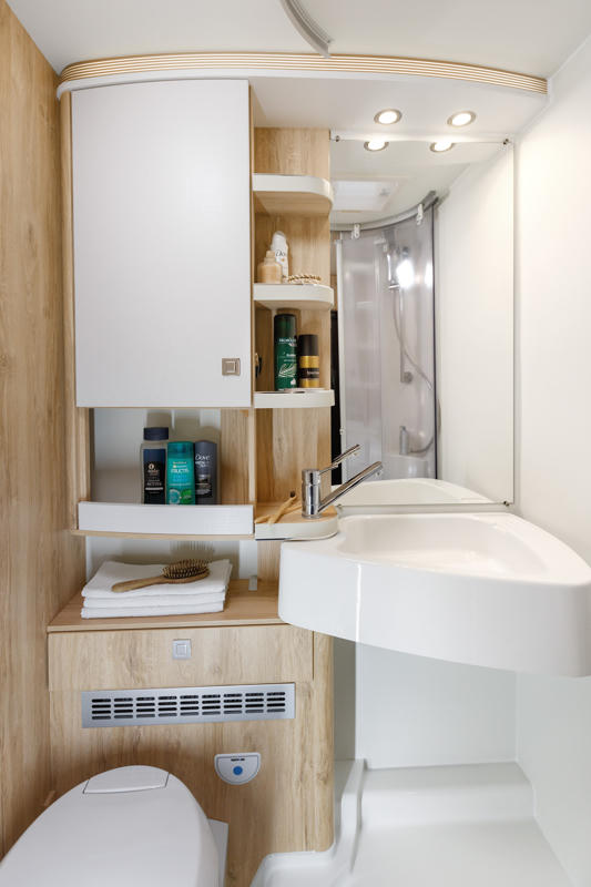 Das Bad besticht durch ein ausklappbares Waschbecken, sodass der Raum ideal genutzt werden kann.