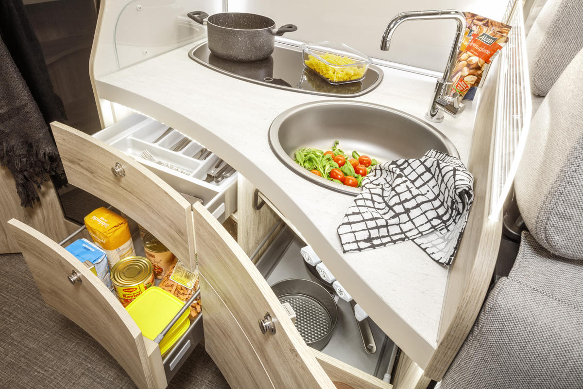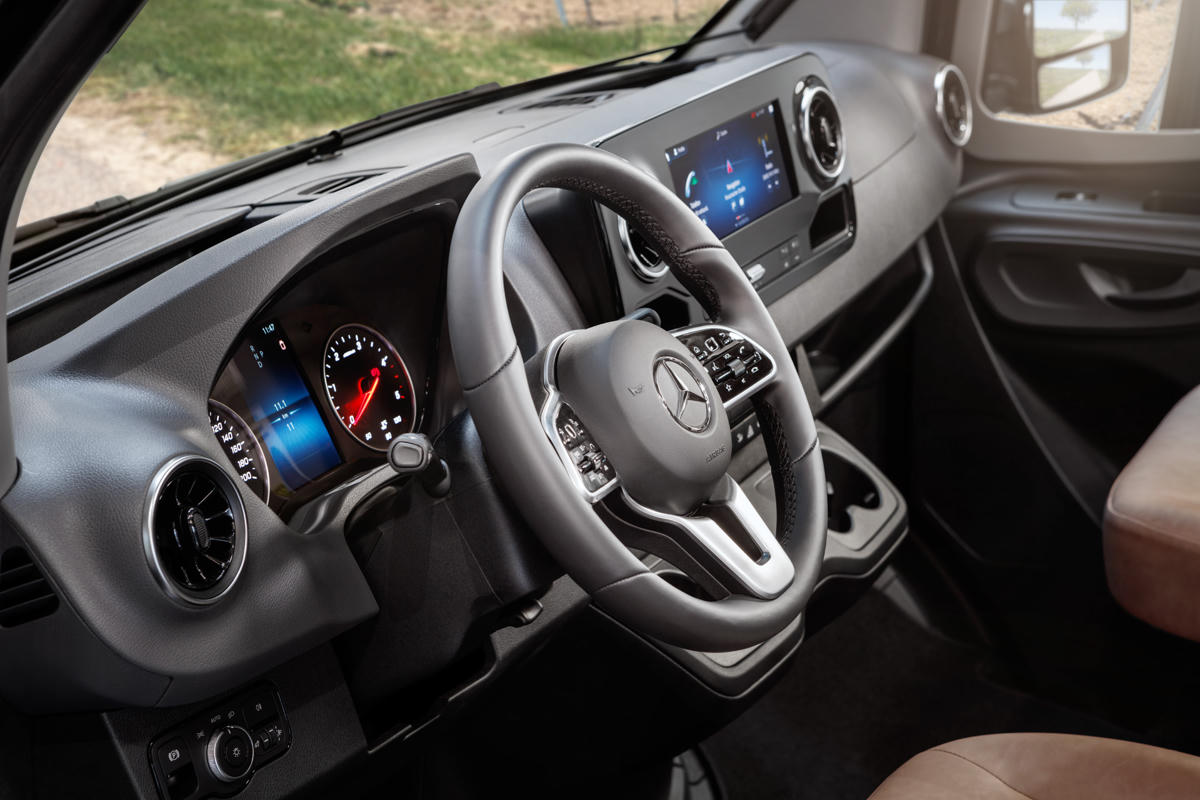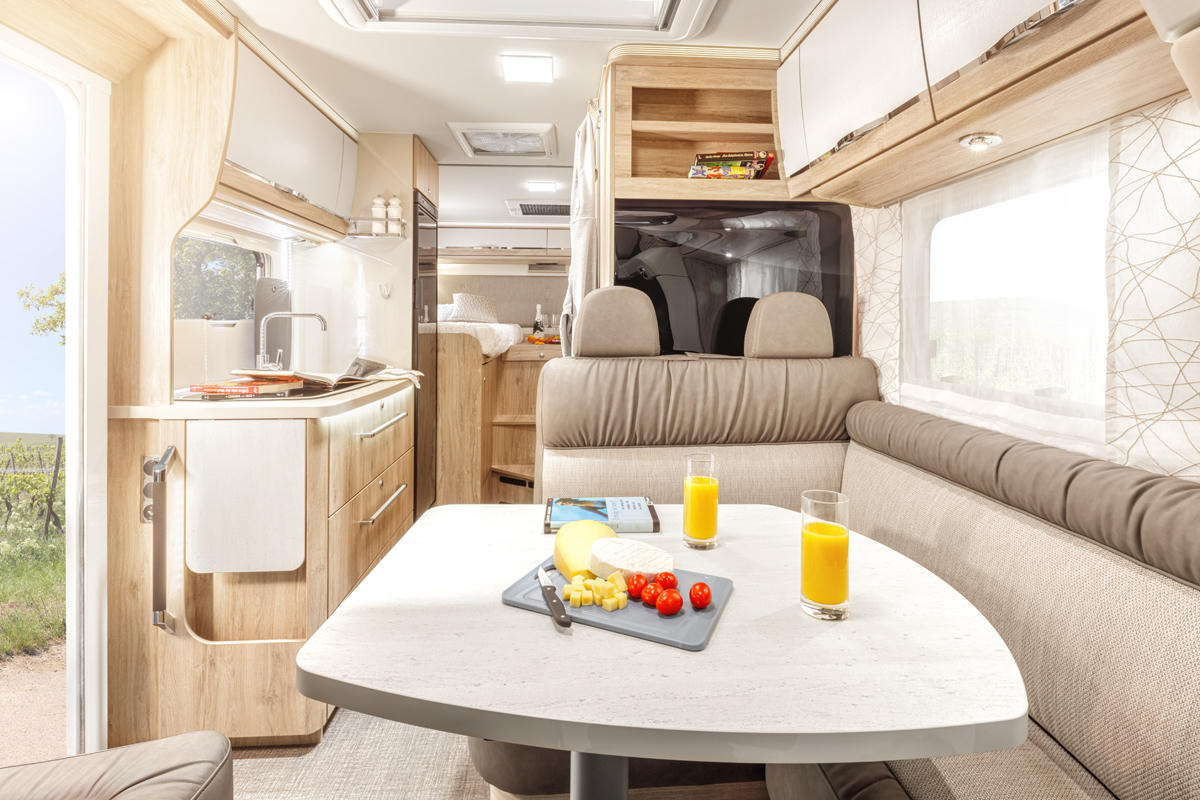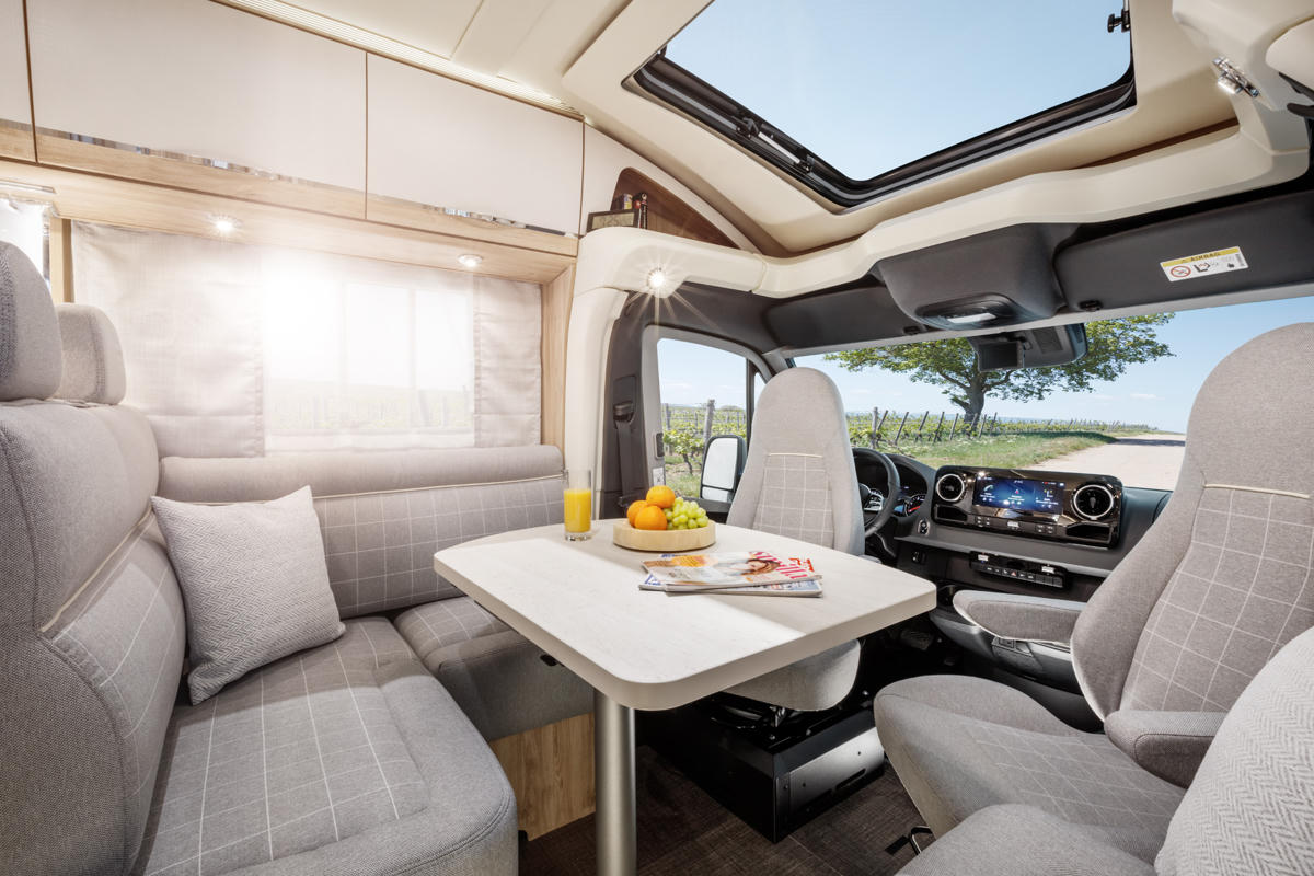 Die Vordersitze in der komfortablen Fahrerkabine mit Radio mit Bluetooth-Funktion sowie Klimaanlage lassen sich vollständig rotieren, sodass eine komplette Sitzecke um den ausklappbaren Tisch entsteht.
