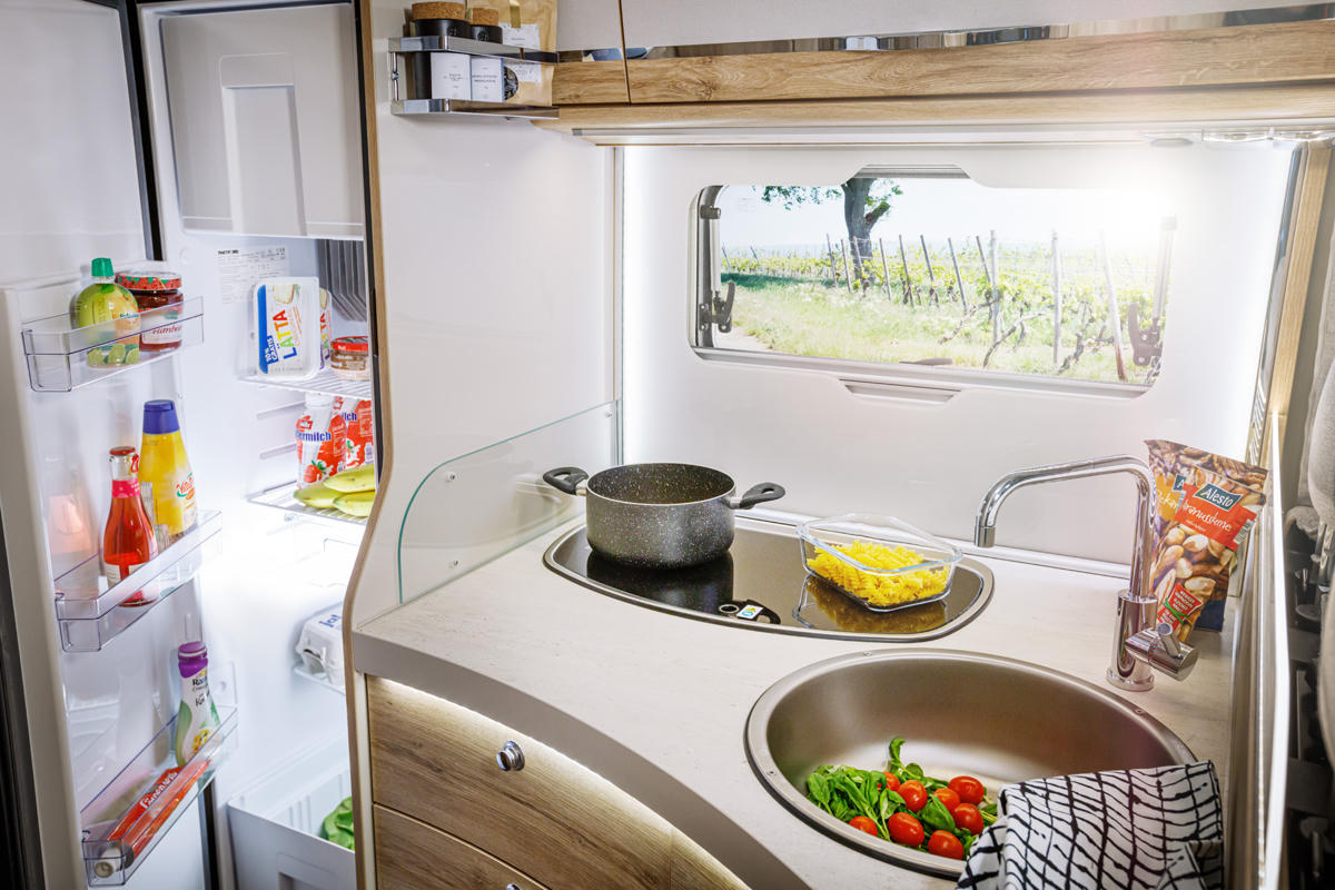 Hinzu kommt eine kleine Küchenzeile mit Gaskocher sowie einem großen Kühlschrank.