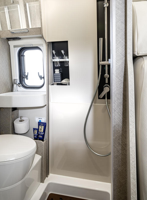 Direkt vor dem Schlafbereich befindet sich das kleine eingebaute Bad mit Warmwasser-Dusche sowie einer Chemietoilette. So ist völlig autonomes Reisen ohne Problem möglich.
