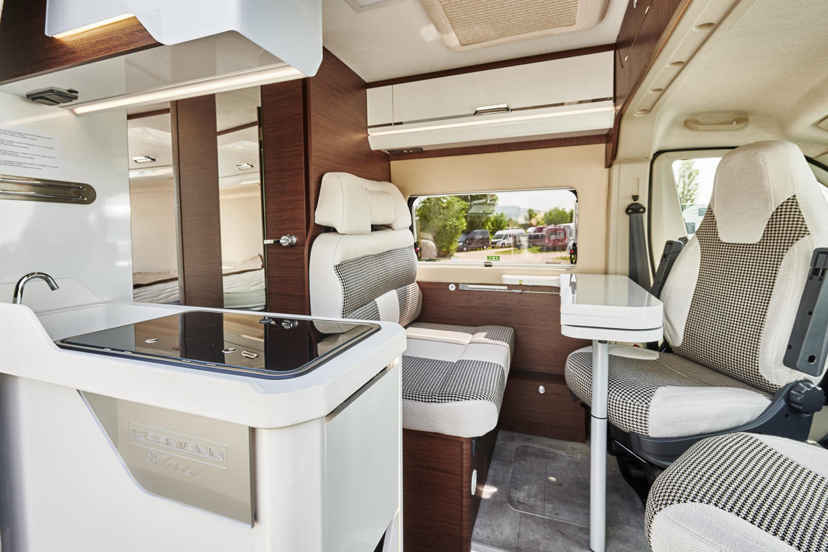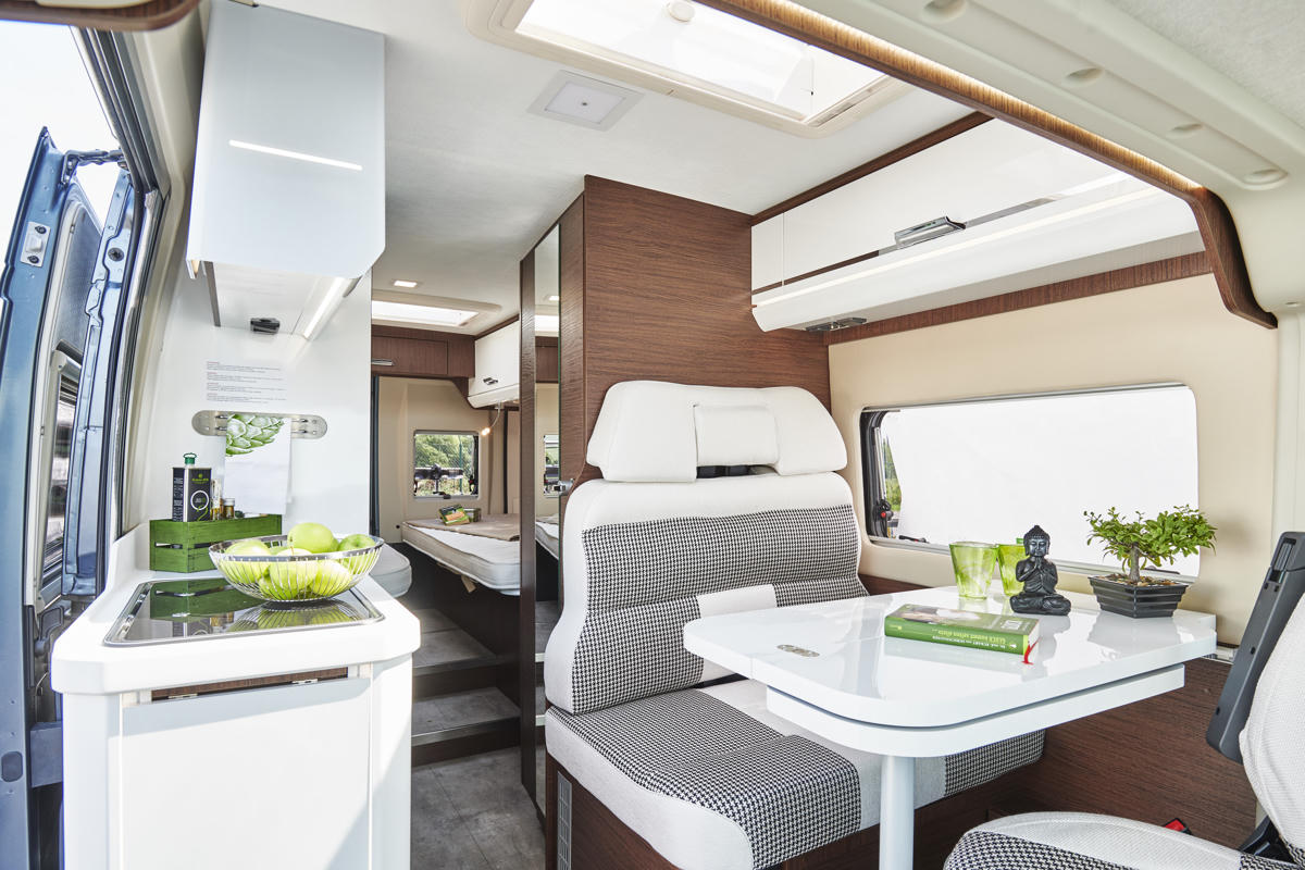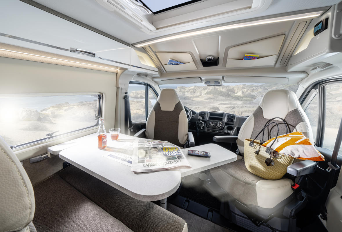 Auch in diesem Modell gibt es vorne in der Fahrerkabine zwei drehbare Sitze. So entsteht durch das Rotieren eine Sitzecke rund um den ausklappbaren Tisch.