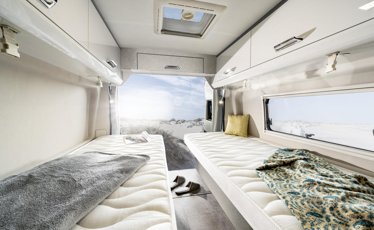 Da sich der Schlafbereich im Heck befindet, lässt sich der Camper so sehr schön in Wohn- und Schlafbereich einteilen. Die Einzelbetten im hinteren Bereich des Fahrzeugs sind 80cm breit und 1,92m bzw. 1,87m lang.