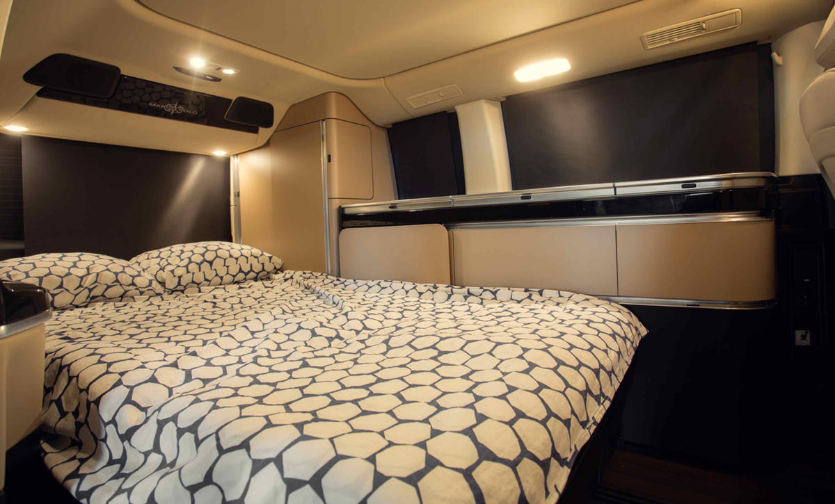 Die vorderen Drehsitze erlaube es euch auch zu viert zusammen im Camper gemütlich zu sitzen. Am Abend können zwei Betten aufgebaut werden. Das untere Bett bemisst sich auf 1,13m x 2,03m. Das obere Bett hat die Maße 1,20m x 2,00m. Durch das Faltdach wird der Innenraum vergrößert. Mit dem ausgefahrenen Dach hat das Fahrzeug eine Innenhöhe von 2,35m. Zum Fahrkomfort gehört auch der Tempomat und die 360-Grad-Parksensoren.