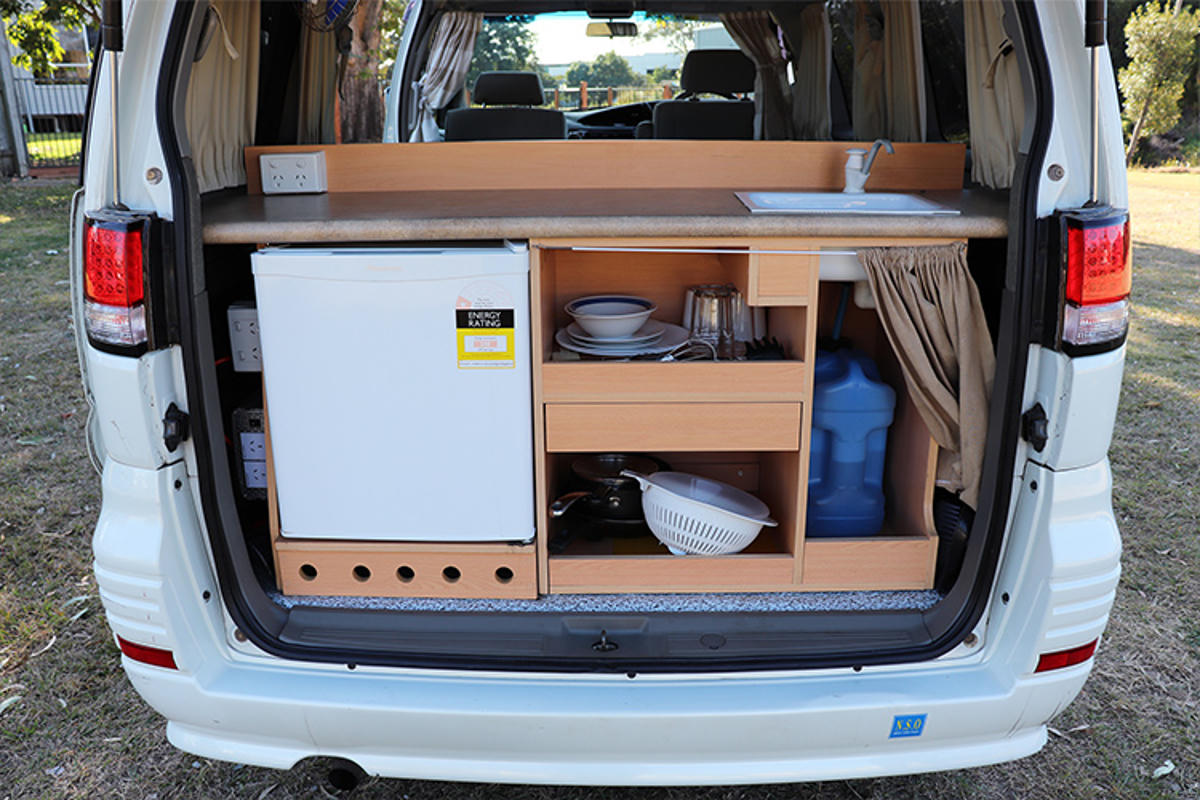 Im Heck befindet sich eine voll ausgestattete Küche mit Spüle, tragbarem Gaskocher und Kühlschrank. Dank Batteriesystem bleibt der Kühlschrank auch während der Fahrt zuverlässig kühl. Auf Campingplätzen kann er über den 240V-Anschluss weiterbetrieben werden.
