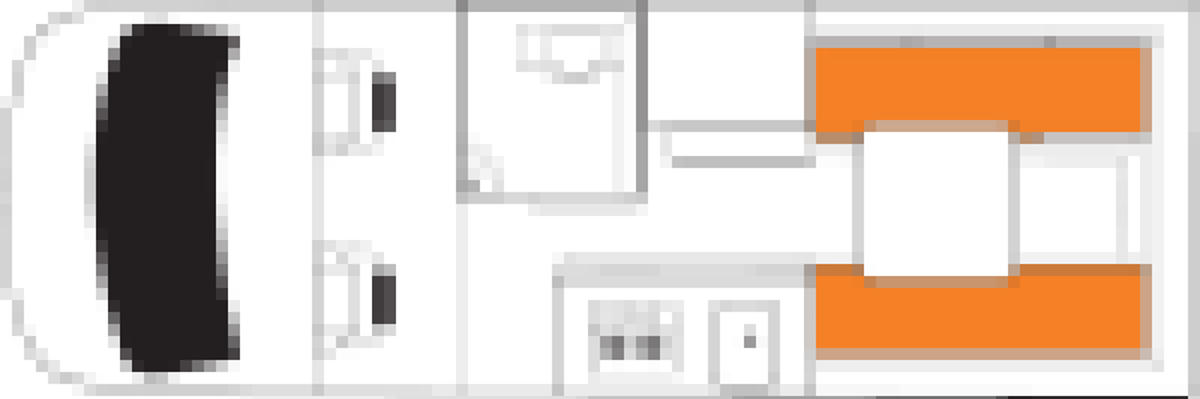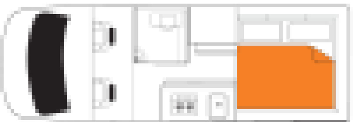 Trotz einer Länge von nur 5,50 m bietet der Trailblazer im Innenraum erstaunlich viel Platz, dank einer durchdachten Raumaufteilung. Direkt neben der Eingangstür befindet sich die Küchenzeile, ausgestattet mit einem zweiflammigen Gasherd und einer Spüle. Beide lassen sich mit einer dafür vorgesehenen Abdeckplatte verschließen, was nicht nur für Sauberkeit sorgt, sondern auch zusätzliche Arbeits- und Ablagefläche schafft. Ein ausklappbarer Tisch an der rechten Seite der Küchenzeile bietet zusätzlichen Platz beim Kochen. Zur Küchenausstattung gehören außerdem ein Kühlschrank und eine Mikrowelle, die allerdings nur bei einem 240V-Anschluss betrieben werden kann. Gegenüber der Küche befindet sich das Bad, ausgestattet mit Dusche, WC und Waschbecken. Im Heck des Trailblazers gibt es eine geräumige Sitzecke, die sich mit wenigen Handgriffen in ein gemütliches Doppelbett verwandeln lässt. Eine Klimaanlage sorgt für angenehme Temperaturen im Innenraum, wobei auch sie nur mit einem 240V-Anschluss betrieben werden kann.