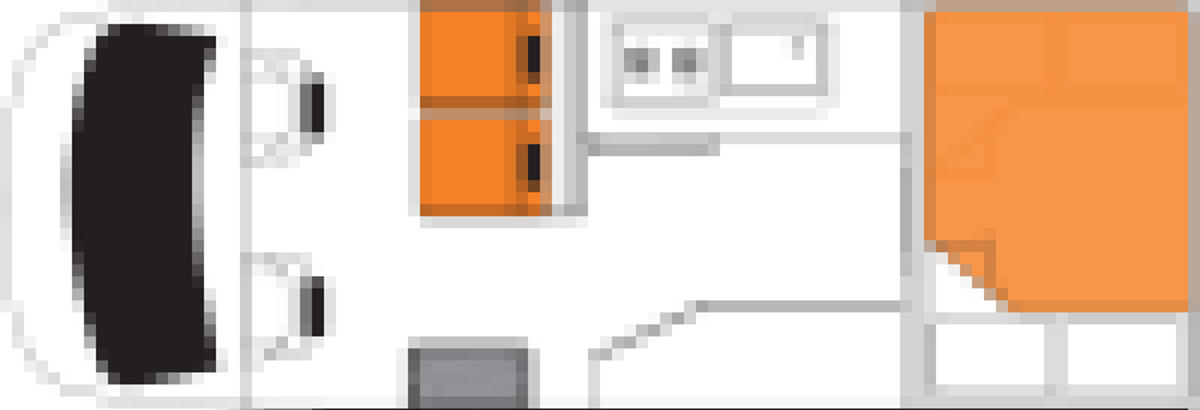 Im vorderen Bereich des 6,10m langen Campers befindet sich die Fahrerkabine sowie direkt dahinter zwei weitere Sitzplätze für Mitreisende. Diese Anordnung ist insbesondere für Familien mit kleinen Kindern vorteilhaft, da man diese somit auch während der Fahrt permanent im Blick hat. Zudem sind die Fahrersitze drehbar und zwischen den Sitzen kann ein Tisch aufgebaut werden. So entsteht mittels weniger Handgriffe eine gemütliche Sitz- und Essecke.