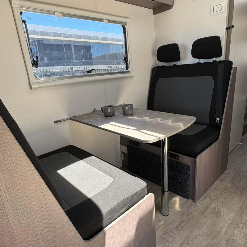 Für die Nacht gibt es drei Doppelbetten in der Wohnkabine des Jayco Excursion 5 Berth, davon eines fest verbaut im Alkovenbereich über der Fahrerkabine. Die beiden anderen Doppelbetten entstehen jeweils nach Umbau der Sitzecken.