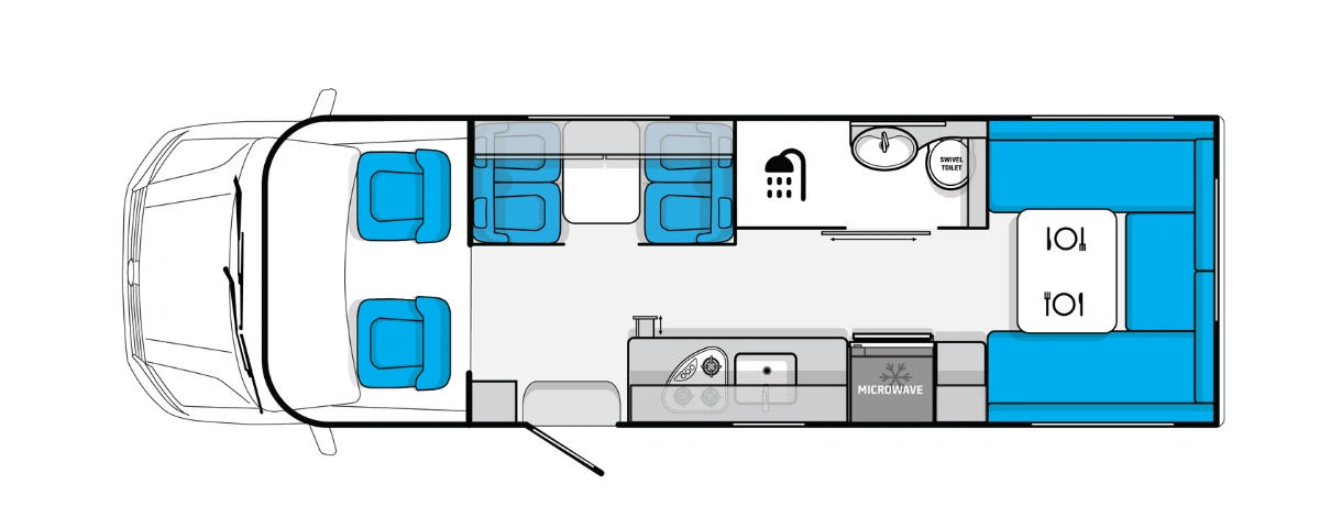 Die Küche ist vollständig eingerichtet und erleichtert das Kochen unterwegs mit 3-flammiger Gasherd, Mikrowelle, Spüle und Koch-/Essgeschirr. Der große 171-Liter-Kühlschrank mit Gefrierfach bietet ausreichend Platz für frische Lebensmittel. Dusche und Toilette sind im kompakten Bad (self-contained) untergebracht. Für angenehme Temperaturen sorgt ein Klima-/Heizsystem, während ein TV mit DVD-Player für Unterhaltung auf Reisen bereitsteht.