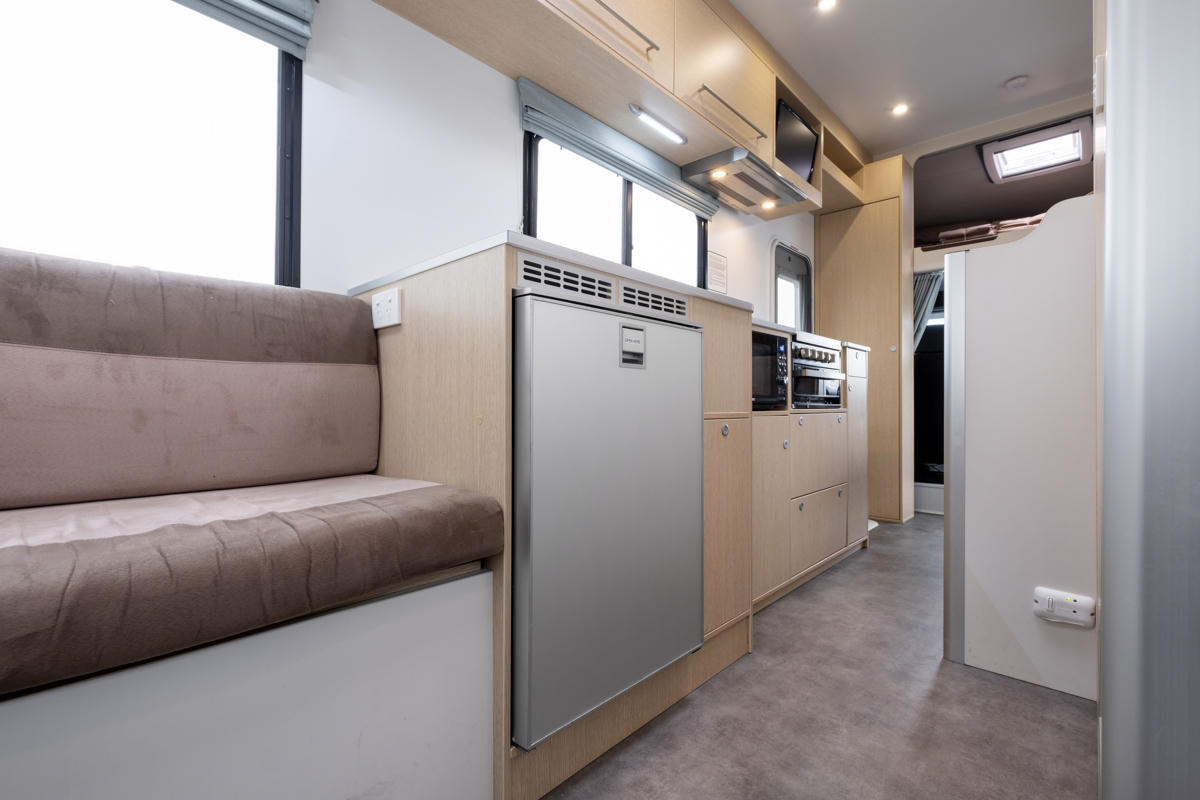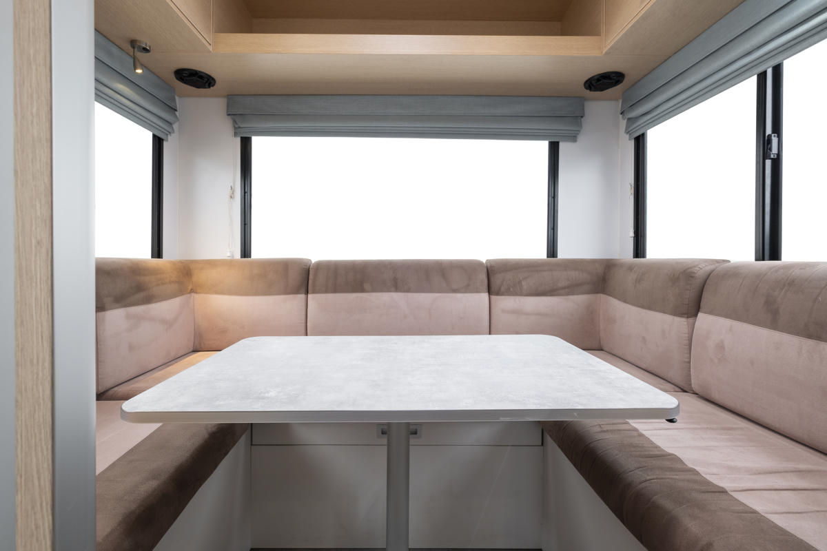 Ausgestattet mit einem vollwertigen Badezimmer mit Dusche und WC genießt ihr maximale Unabhängigkeit unterwegs. Die komplett ausgestattete Küche mit Gasherd, Kühlschrank und Mikrowelle ermöglicht entspanntes Kochen wie zuhause, während zwei Essbereiche genügend Raum für gemeinsame Mahlzeiten bieten. Dank Klimaanlage und Heizung (bei Anschluss an 240V Landstrom) reist ihr zu jeder Jahreszeit angenehm. Zusätzlich sorgen 12V-Batterie, Solarpanel sowie großzügige Frisch- und Abwassertanks für noch mehr Freiheit beim Campen.