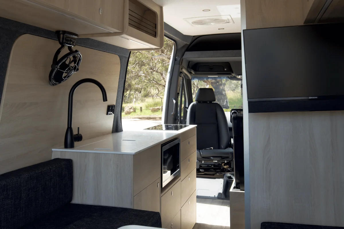 Der Camper ist ideal für Paare, die Australien weit und unabhängig entdecken möchten – ohne auf Komfort zu verzichten. Auf Basis des Mercedes-Benz Sprinter LWB mit 9-Gang-Automatik bietet er ruhiges, sicheres Fahrverhalten und modernste Assistenzsysteme.