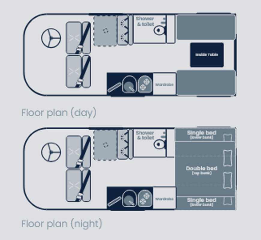 🛏️ Im hinteren Teil des ersten Layouts rundet ein permanent eingebautes Doppelbett das durchdachte Fahrzeug ab. Dadurch entfällt die Notwendigkeit, das Bett auf- und abzubauen, und es steht dauerhaft bereit. Das andere Modell hingegen verfügt im Heck über ein Doppelbett (1.84m x 1.32m) sowie zwei kleine Einzelbetten (1,76m x 0,63m).