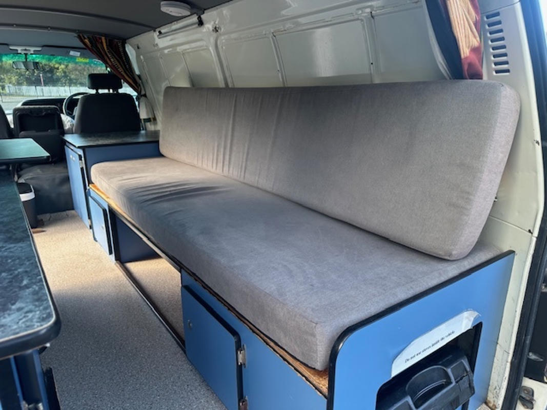 Gegenüber der Kochzeile befindet sich eine Sitzbank, die sich nachts in einen Schlafplatz verwandelt. Dieses Bett hat die Maße 1.90m x 1.04m und bietet auf engem Raum Platz für 2 Personen.