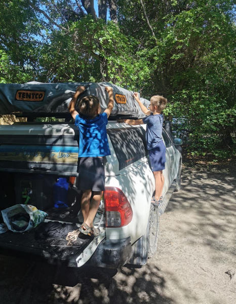 Die Schlafplätze wechselten während der Reise. Anfangs schliefen jeweils ein Kind mit einem Erwachsenen, später dann die Kinder gemeinsam in einem Zelt und die Erwachsenen im anderen. Beim Aufbau der Dachzelte halfen alle mit, wobei die Zelte insgesamt sehr einfach zu handhaben waren: Leiter ausfahren, Zelt aufklappen, Zeltstangen einstecken, Schlafsäcke ausbreiten und schon war alles fertig. Praktisch war außerdem, dass die Schlafsachen im Dachzelt bleiben konnten. Der Schlafkomfort war gut: Die Zelte waren groß genug und die Matratzen in Ordnung. Die Schlafsäcke waren schon etwas älter, aber sauber und hielten nachts warm. Außerdem erhielten wir Kopfkissen. Zusätzlich hatten wir dünne Schlafsack-Inlets dabei, die sich als sehr praktisch erwiesen.