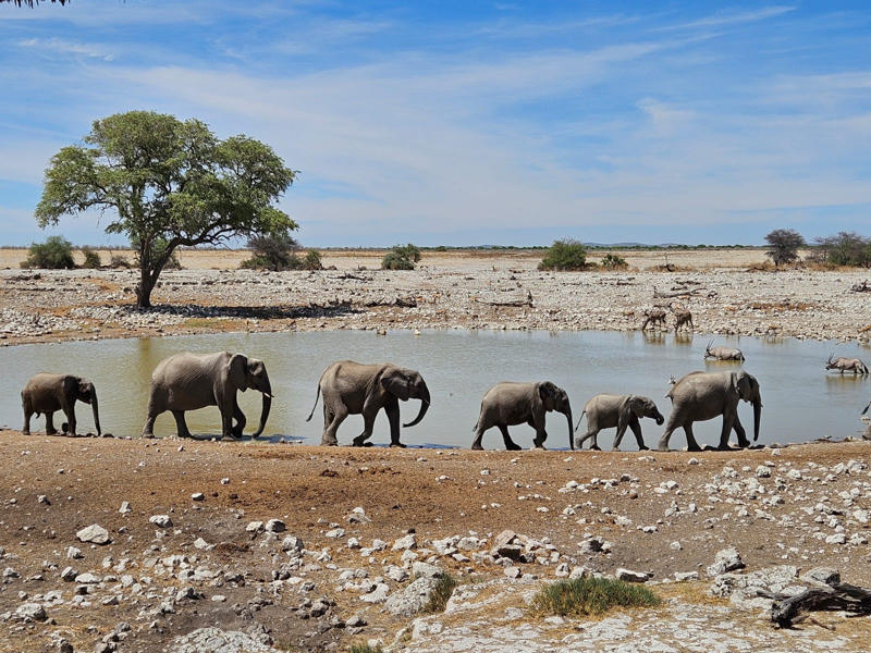 Und dann war da natürlich noch der Etosha-Nationalpark, eines der bekanntesten Wildschutzgebiete Afrikas. Der Besuch dort war wirklich ein Highlight der Reise - die riesigen Ebenen, die Tierbeobachtungen und dieses Gefühl, der Natur ganz nah zu sein - einfach unbeschreiblich. Wir schliefen zunächst eine Nacht vor dem Park im Etosha Safari Camp/Gondwana Collection am Anderson Gate. Der Campingplatz außerhalb des Parks war gut, und nachts bekamen wir sogar Besuch von Zebras, die über den Platz zogen. Ganz spontan buchten wir eine Safari für den nächsten Morgen. Die Tour war richtig toll und ein perfekter Einstieg in Etosha. Die nächste Nacht verbrachten wir dann direkt im Etosha-Nationalpark auf dem Okaukuejo Campingplatz. Der Platz selbst war eher eng und nicht besonders schön, dafür entschädigte aber das Wasserloch: Dort gab es unglaublich viele Tiersichtungen im Dunkeln. Am Abend saßen wir lange am Wasserloch auf dem Campingplatz und genossen es, die Tiere zu beobachten. In Okaukuejo bezahlten wir unsere Parkgebühren. Safaris kann man hier ebenfalls buchen, allerdings erst ab 6 Jahren! Wir waren froh, dass wir am Tag zuvor schon eine Safari gemacht hatten, denn dabei spielte das Alter keine Rolle und wir hatten trotzdem die tolle Tiererfahrung. Am nächsten Tag fuhren wir mit unserem Auto von dort weiter durch den Nationalpark, diesmal ohne weitere Übernachtung im Park. Stattdessen verbrachten wir die Nacht außerhalb des Parks im Osten. Für unsere Kids war die Kombination aus Safari und Selbstfahren stimmig. Ebenso haben ihnen zwei Tage Safari gereicht. Das lange Sitzen im Auto war anstrengend für sie - hier halfen Hörspiele und Musik.