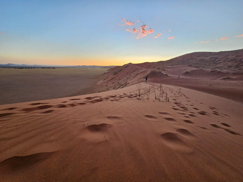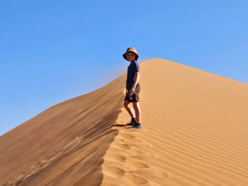 Ein weiterer beeindruckender Stopp war der Besuch der Namib-Wüste. Wir übernachteten auf dem Campingplatz Sesriem des NWR. Er war eher funktional und enger als die bisherigen Campingplätze, dafür aber super gelegen. Von dort aus machten wir uns auf zur Dune 45. Der Aufstieg war zwar anstrengend, aber fühlte sich wie ein riesiger Sandkasten an – richtig viel Spaß! Insgesamt hat uns die Wüste total begeistert. Zum Sonnenuntergang fuhren wir die Elim Düne an. Das Licht war einfach atemberaubend, der Sand leuchtete tiefrot, und die Stimmung war wunderschön. Die roten Dünen und Salzpfannen rund um Sesriem sind wirklich beeindruckend. „Big Daddy“ und „Big Mama“, die weltbekannten riesigen Dünen im Sossusvlei, haben wir mit den Kindern bewusst ausgelassen. Die Dünen wären für die Kinder zu hoch, sodass wir die Autofahrt dorthin vermieden, da wir so oder so viel Zeit im Auto verbrachten. Am nächsten Morgen haben wir zum Abschluss noch den Sesriem Canyon besucht.