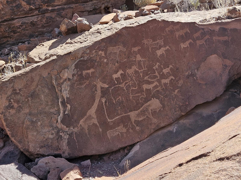 Twyfelfontein hat uns ebenso sehr fasziniert. Wir besichtigten die dortigen Feldmalereien, die uns in eine längst vergangene Zeit führten. Die Begegnung mit den Wüstenelefanten dort war ein weiteres unvergessliches Erlebnis - diese majestätischen Tiere in ihrer natürlichen Umgebung zu sehen, war einfach magisch. Die Tour zu den Elefanten konnten wir direkt am Camp buchen. Das Camp war etwas abgelegen von Twyfelfontein, für uns aber schön gelegen.