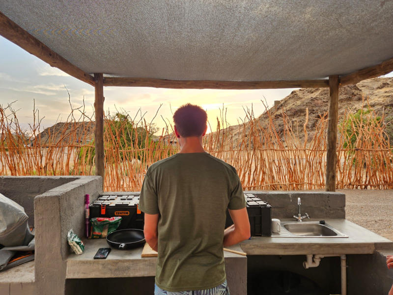 Die Einweisung war ausführlich, gut strukturiert und ließ keine Fragen offen. Uns wurde alles gezeigt: vom Aufbau der beiden Dachzelte über das komplette Camping-Equipment bis hin zu Ersatzrad, Werkzeug und Allradantrieb. Besonders hilfreich waren die vielen praktischen Hinweise, zum Beispiel zum Reifendruck. Aufgrund des Gewichts der zwei Dachzelte, wurde uns ein Druck von 2,0 bar empfohlen. Das Camping-Equipment umfasste zwei Kochboxen: eine mit Kochutensilien (Topf, Pfanne, Wender und Wasserkocher, etc.), die zweite mit Geschirr für sechs Personen (Teller in zwei Größen, Schüsseln, Gläser, Becher und Besteck) - alles eher basic, aber absolut ausreichend. Die Pfanne haben wir unterwegs ersetzt und am Ende der Reise dem Anbieter überlassen. Auf Nachfrage erhielten wir eine zusätzliche Box für Vorräte – eine super Hilfe und definitiv empfehlenswert, um die Sachen im Kofferraum gut zu verstauen. Der große Kühlschrank, zwei im Auto verbaute Batterien und die Möglichkeit, auf dem Campingplatz Strom anzuschließen, sorgten für zusätzlichen Komfort.