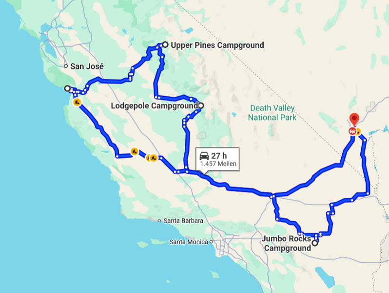 Unser nächstes Ziel war der Yosemite Nationalpark, und wie sollte es anders sein: Auch diesmal erreichten wir unseren Campingplatz erst im Dunkeln. (Kleiner Spoiler an dieser Stelle: Während der gesamten Reise haben wir es vermutlich nur ein einziges Mal geschafft, wirklich im Hellen anzukommen.) 😂