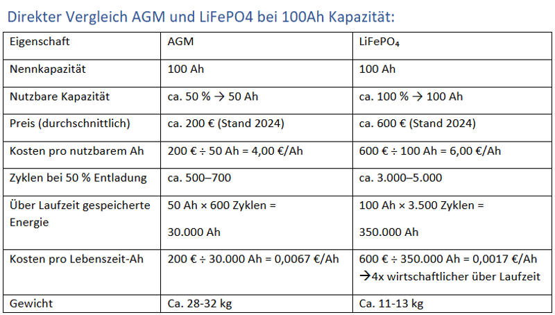 Durch die höhere nutzbare Kapazität und deutlich längere Lebensdauer sind LiFePO₄-Batterien langfristig ca. vier Mal wirtschaftlicher, trotz höherem Einstiegspreis.
