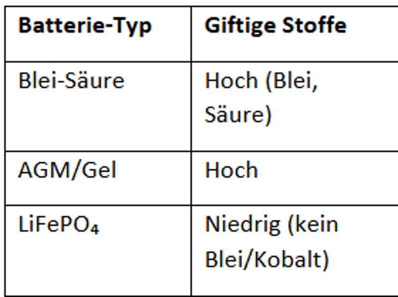 Batterien wie Blei-Säure, AGM, Gel und LiFePO₄ unterscheiden sich deutlich in ihrer Umweltbilanz. Blei-Säure-Batterien – inklusive AGM- und Gelvarianten – enthalten giftiges Blei und Schwefelsäure. Sie sind zwar gut recycelbar, aber bei unsachgemäßer Entsorgung stark umweltschädlich. AGM- und Gelbatterien sind auslaufsicherer, bringen jedoch die gleichen Schadstoffe mit sich.