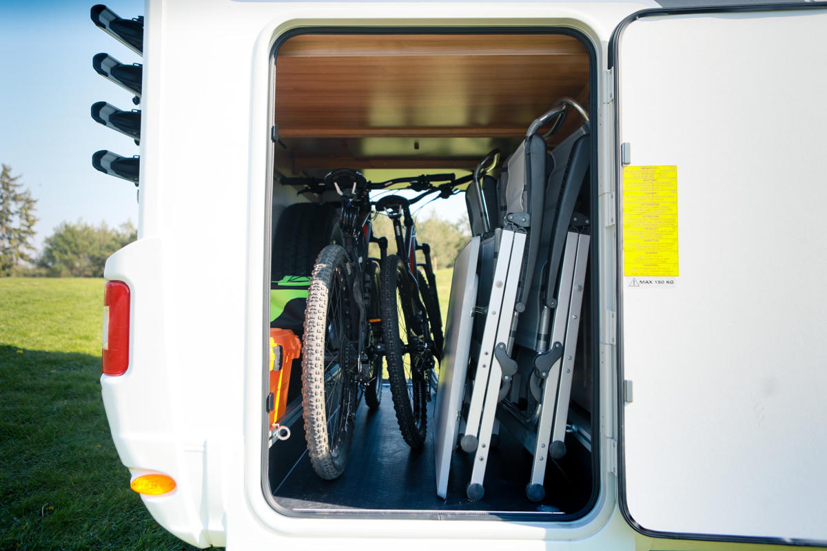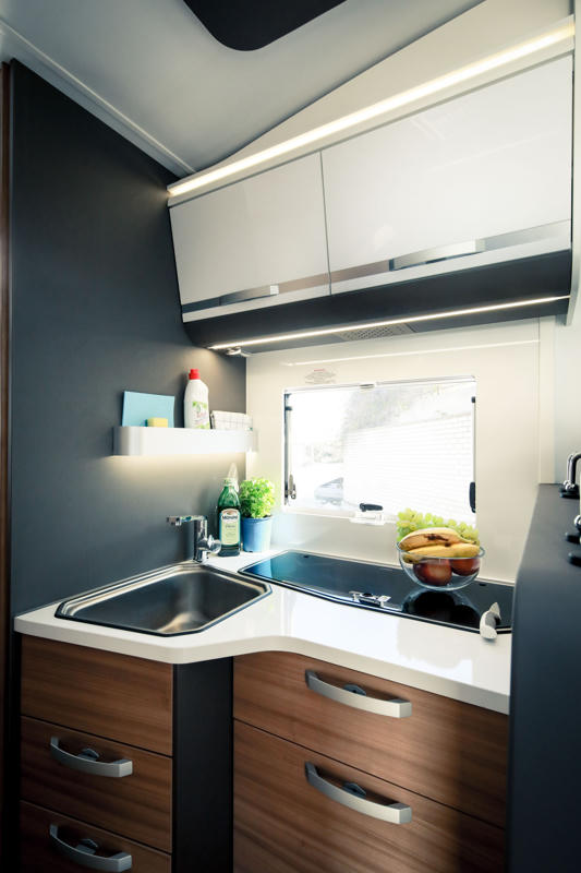 Hinter den zwei drehbaren Sitzen der Fahrerkabine sitzen zwei weitere Personen auf der Sitzbank in Fahrtrichtung. Hier entsteht im Nu eine komfortable Sitzecke mit verlängerbarem Tisch. Dahinter kann in der Küche mit Kühlschrank und Gasherd gekocht werden. Geschlafen wird im Doppelbett hinten oder im herunterfahrbarem Hubbett über dem Wohnraum.