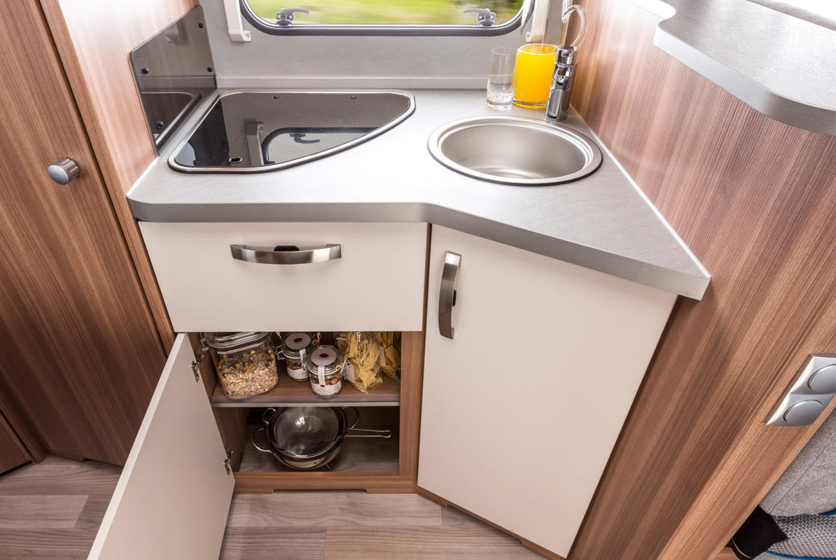 Die Küche fällt zwar etwas kleiner aus, aber es fehlt an nichts. Ein 145 L Kühlschrank mit Gefrierfach, ein 3-flammiger Gasherd und eine Spüle mit 100 L Frischwasservermögen stehen zur Nutzung bereit.