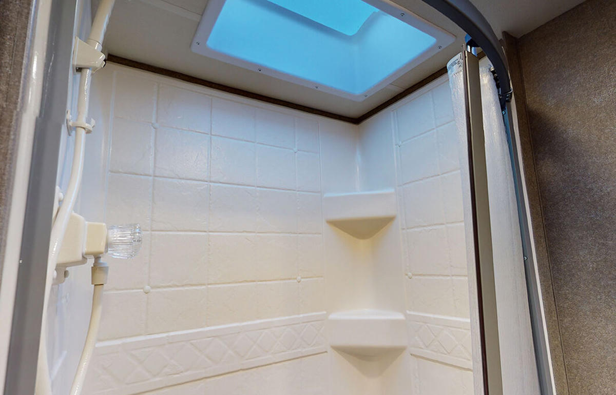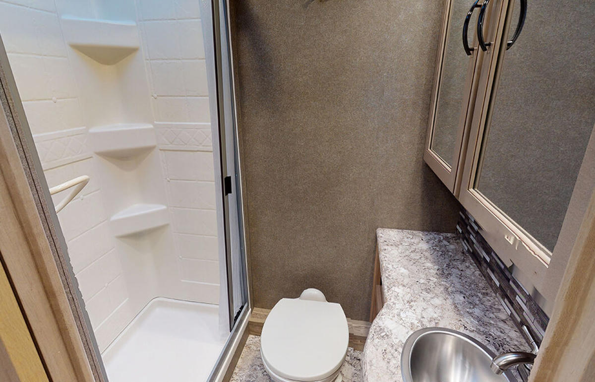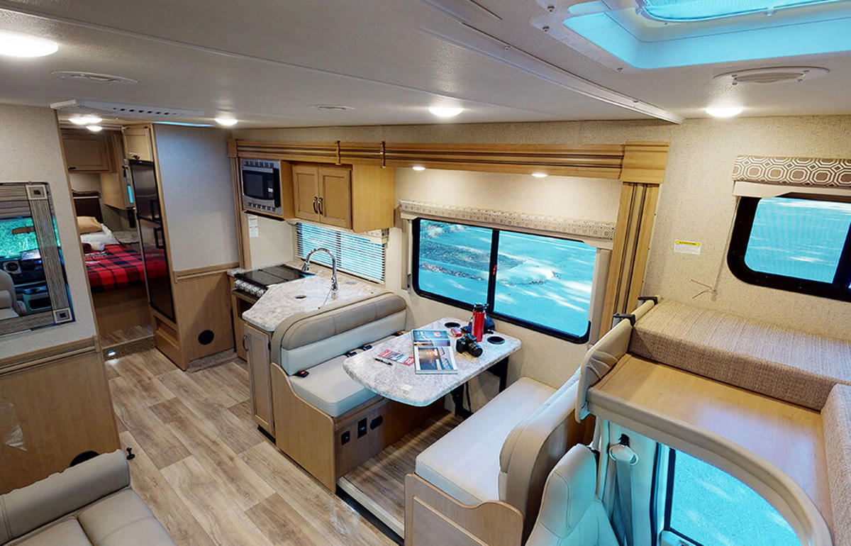 Im Innenraum überzeugt der Class C XLarge von Fraserway RV durch eine gut ausgestattete Küche mit Ofen, Mikrowelle und einen Wohnbereich mit ausziehbarem Slide‑Out zur Vergrößerung des Platzangebots und zahlreiche Komfortfeatures wie Dach‑Klimaanlage, Dual‑Batterie‑System und Back‑up‑Kamera. Das Badezimmer ist mit einer separaten Dusche und einer Toilette ausgestattet und rundet die funktionale Einrichtung ab. Schlafgelegenheiten gibt es im permanenten Schlafzimmer im Heck, im großzügigen Alkoven‑Bett über der Fahrerkabine sowie durch Umwandlung von Dinette und Sofa zu weiteren Betten – so können alle Reisenden bequem übernachten.