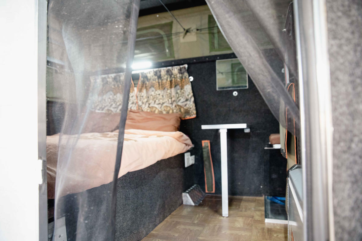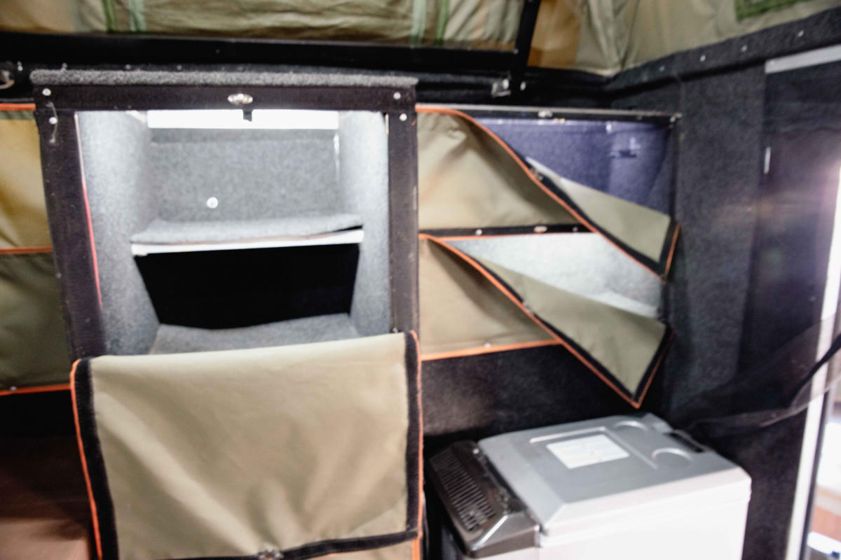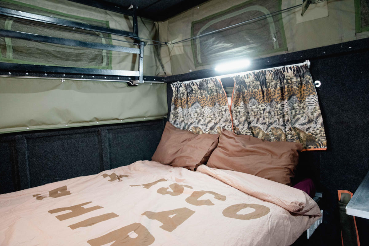 In der aufgesetzten Wohnraumkabine befindet sich ein Doppelbett (1,80m x 1,50m) sowie eine Toilette. Das Dach der Kabine ist ausfahrbar, womit sich die Innenhöhe von 1,38m auf ca. 1,90m erhöht. Im Innenraum gibt es LED-Lichter sowie 220V Steckdosen zum Aufladen von Geräten. Außerdem bietet die Wohnkabine verschiedene Stauraummöglichkeiten und eine solide Camping-Ausrüstung. Hinzu kommt eine umfangreiche 4WD-Ausstattung, inklusive zwei Ersatzrädern und Kompressor.