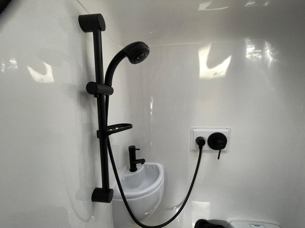 Im Inneren erwartet euch eine voll ausgestattete Küche mit 90 L Kühlschrank, 2-Flammen-Gaskocher, Spüle und viel Stauraum für Vorräte. Ein echtes Plus für längere Touren ist das vollwertige Badezimmer mit separater Dusche und Toilette – selten in dieser Fahrzeugklasse.