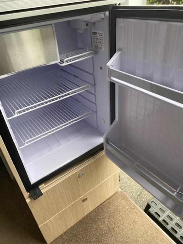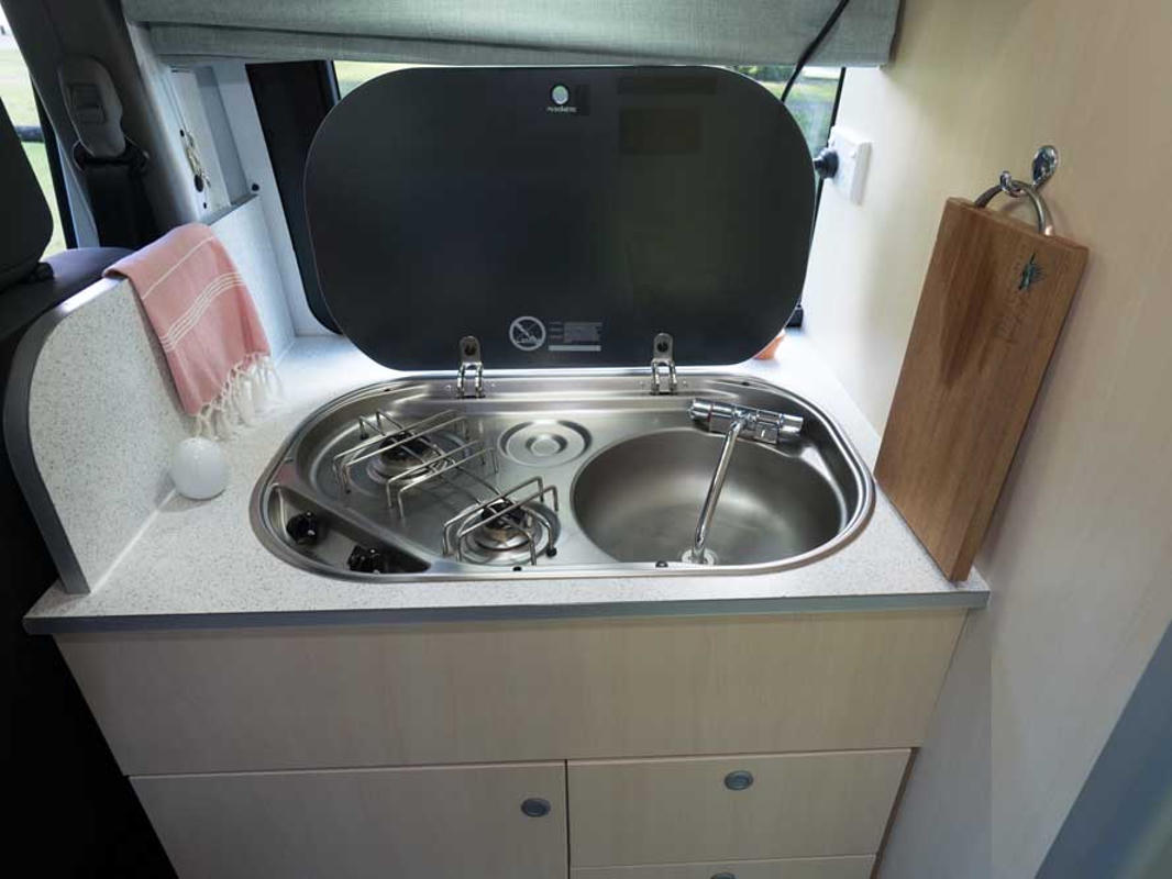 Die Küchenzeile ist ausgestattet mit einem 2-Flammen-Gaskocher, einer Mikrowelle, Spüle, 85L Kühlschrank und Küchenausstattung (Töpfe, Pfannen, Teller, Besteck und mehr), die dir volle Unabhängigkeit beim Kochen ermöglichen.