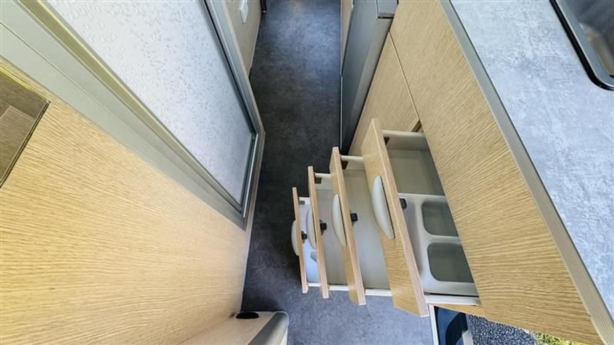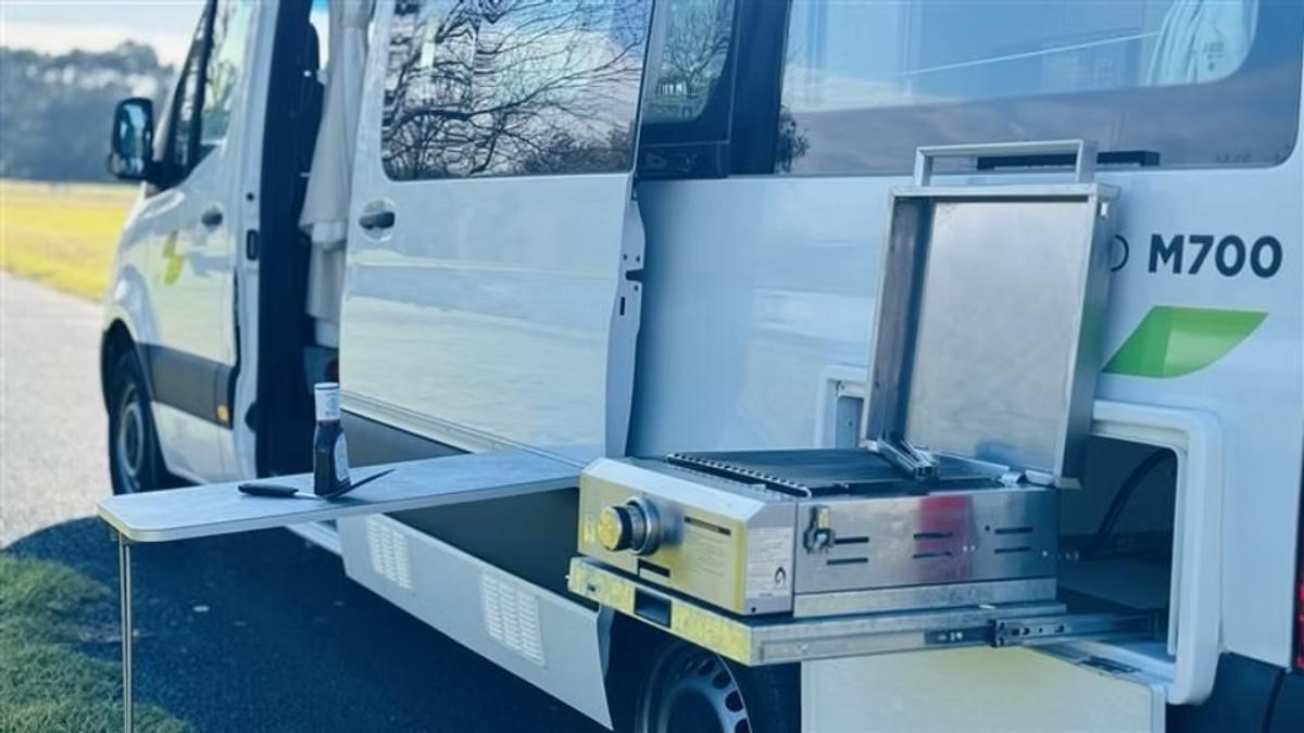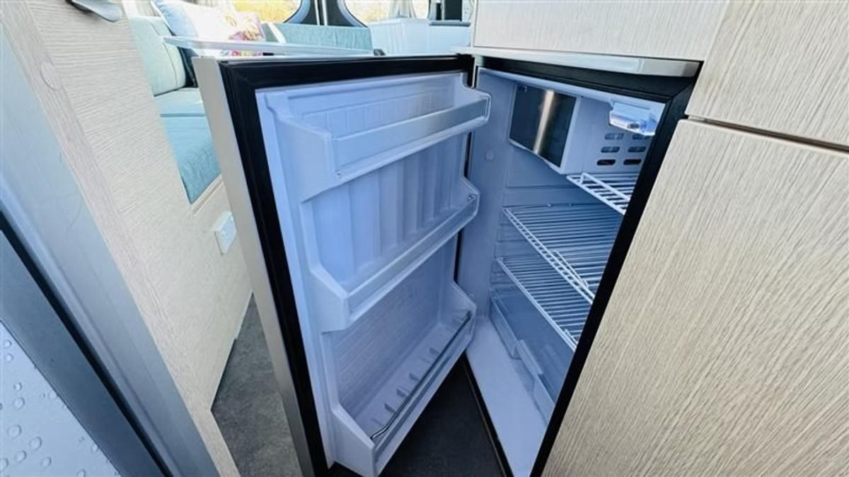Die Küche ist voll ausgestattet und bietet neben einem zweiflammigen Gasherd, einer Spüle und reichlich Stauraum auch eine Dunstabzugshaube, einen großen Kühlschrank (130L) inkl. Gefrierfach sowie eine Mikrowelle. Für mehr Flexibilität unterwegs steht dir sogar ein Außen-BBQ zur Verfügung. Das kompakte Badezimmer ist mit Dusche und schwenkbarer Toilette (19,3 l) gestaltet – damit bist du unabhängig von Campingplätzen.