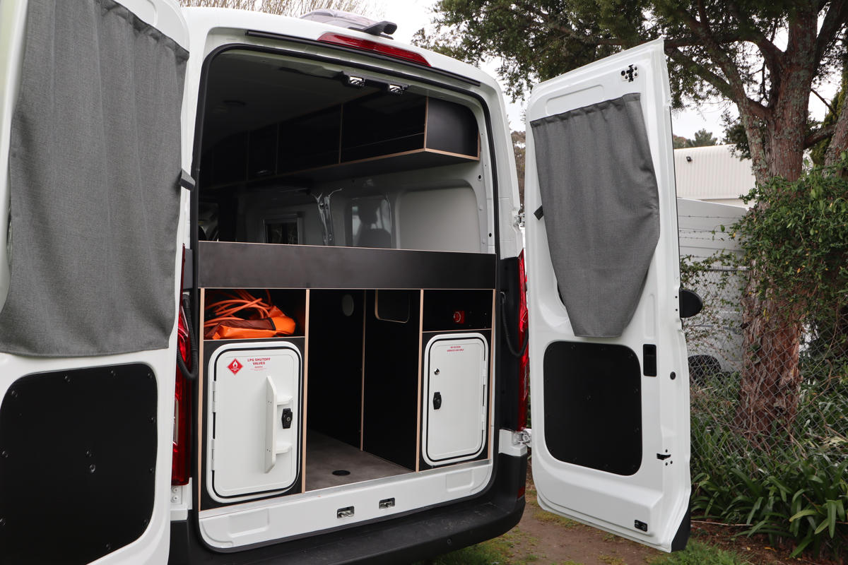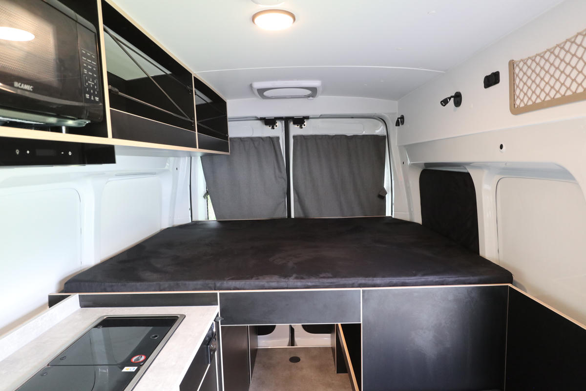 Der Wohnbereich ist durchdacht gestaltet: Ein permanentes Doppelbett (1,85 m x 1,40 m) sorgt für entspannte Nächte, während sich die Vordersitze zum Essbereich mit Tisch drehen lassen. Unter dem Bett bietet ein großes Fach genügend Stauraum für Gepäck.