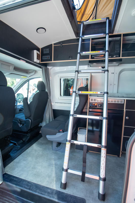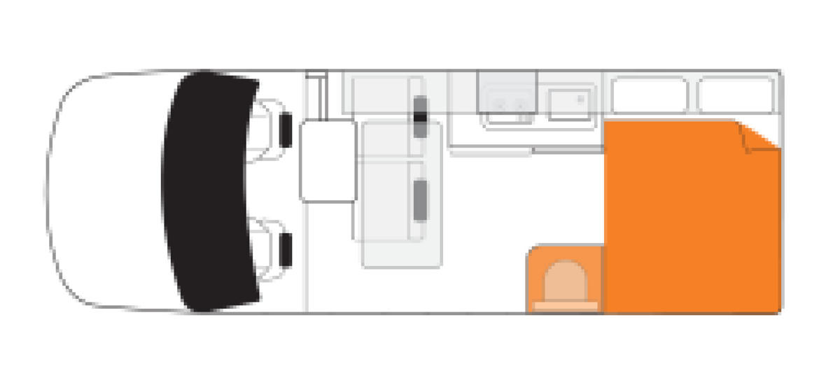 Die Küche verfügt über einen Gaskocher, eine Mikrowelle (nutzbar bei Landstrom) und einen 113 L Kühlschrank mit Gefrierfach, sodass Ihr unterwegs jederzeit Mahlzeiten zubereiten könnt. Die Vordersitze der Fahrerkabine lassen sich zum Essbereich mit Tisch drehen, sodass ihr zu viert gemeinsam essen könnt.