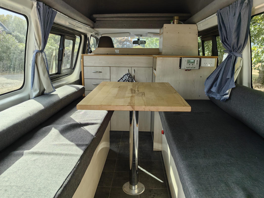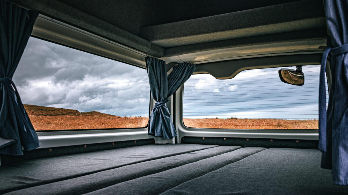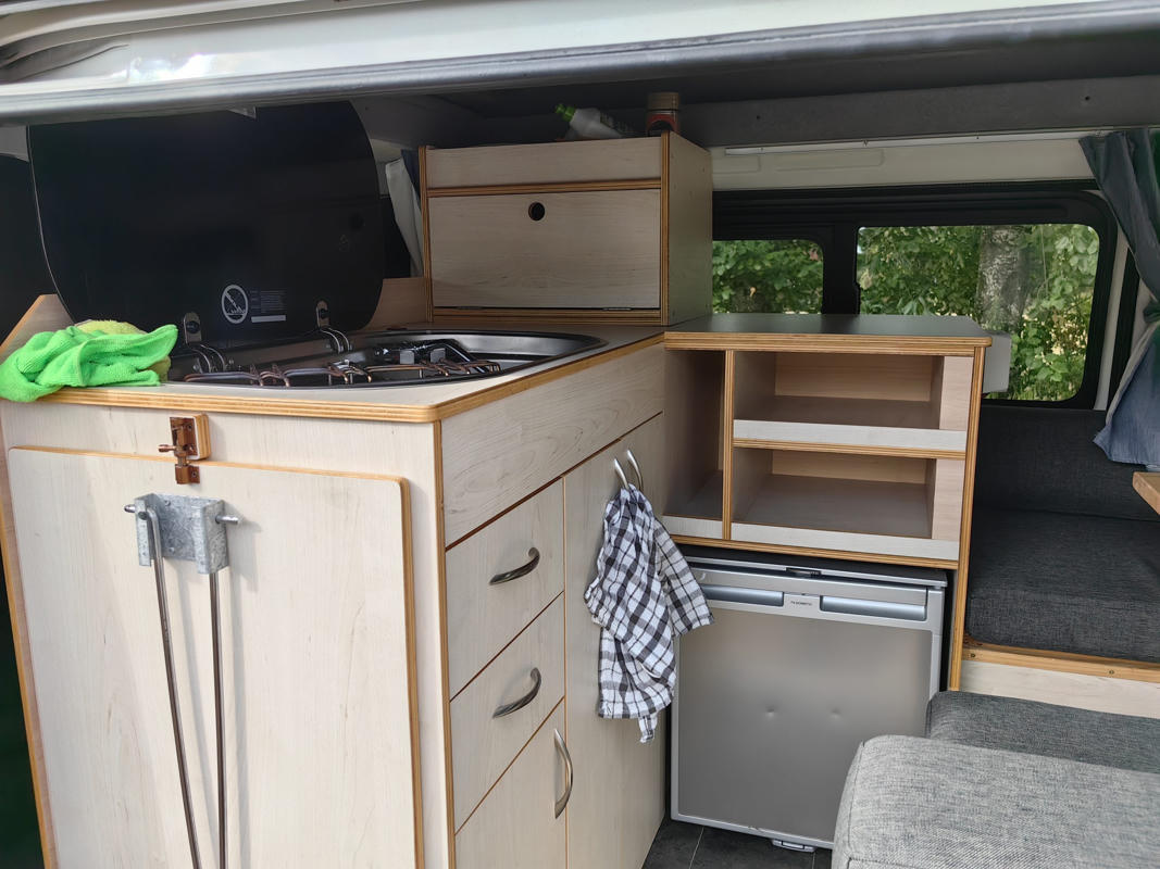 Im Innenraum erwarten dich eine angenehme Stehhöhe von 1,85 m und viel Stauraum. Die voll ausgestattete Küche mit portablem Gaskocher, Mikrowelle, Kühlschrank und Spüle (40 l Frisch- und Abwassertank) ermöglicht dir unabhängiges Kochen unterwegs. In der Nacht wird komfortabel auf einem Doppelbett (185 × 155 cm) oder im Hochdach auf einem Einzelbett (158 × 138 cm) in Schlafsäcken geschlafen.