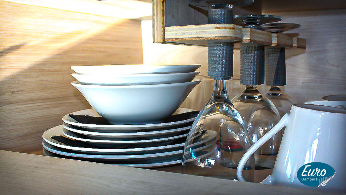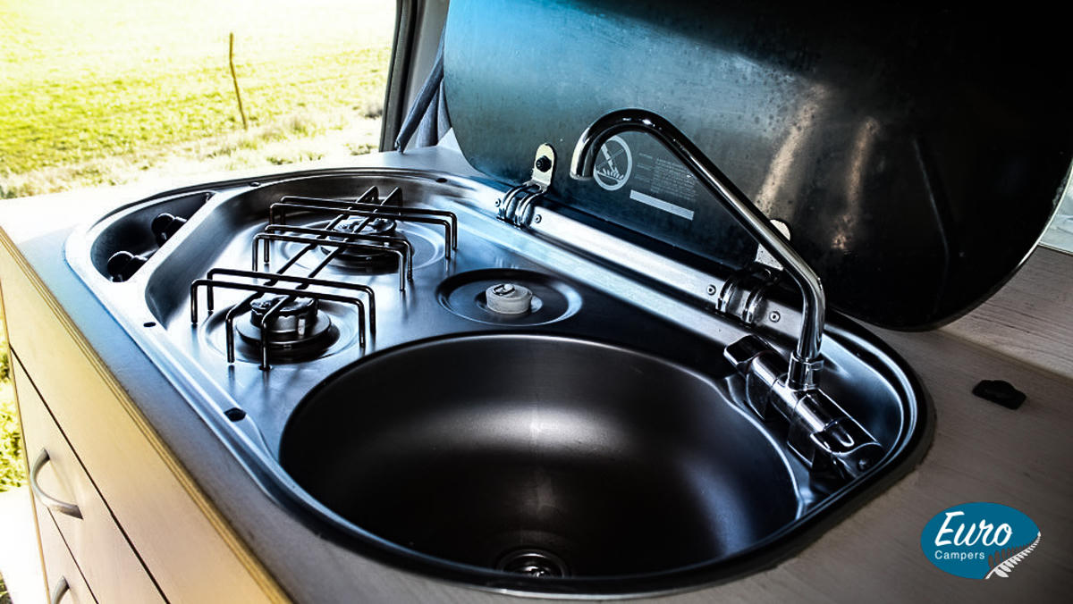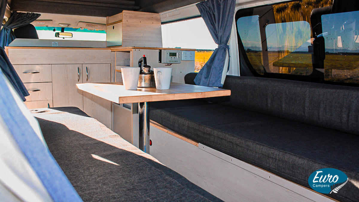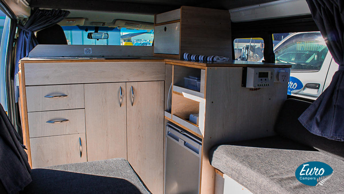 Der Innenausbau wurde 2019 gefertigt und bietet eine solide Ausstattung für ein unabhängiges Abenteuer durch Neuseeland. In der Küche kann dank einer Innenhöhe von 1,95m bequem gekocht werden. Dazu steht ein 2-flammiger Gasherd zur Verfügung. Außerdem stehen Geräte wie Wasserkocher und Toaster (jeweils bei 240V) sowie ausreichend Geschirr und Kochutensilien zur Verfügung. Der Kühlschrank fasst 60L und besitzt ein Gefrierfach. Die Wohnraumbatterie wird von einer Solaranlage auf dem Dach unterstützt. Außerdem ist im vorderen Wohnbereich eine tragbare Toilette verstaut, dank welcher der Euro Sky 3 self-contained zertifiziert ist. Hinzu kommt eine Solar Dusche für den Außenbereich. Somit steht dem günstigen Freedom Camping nichts im Weg.