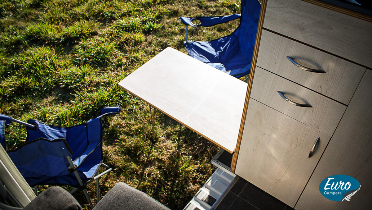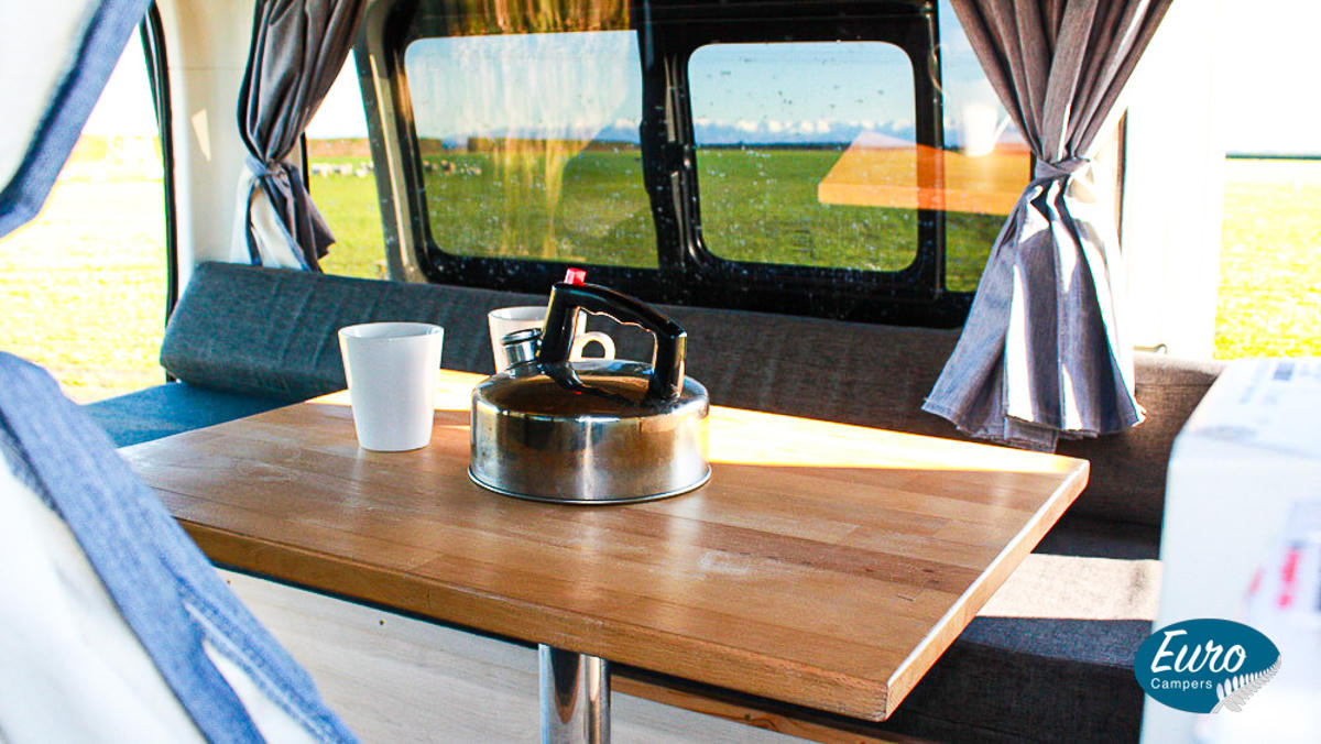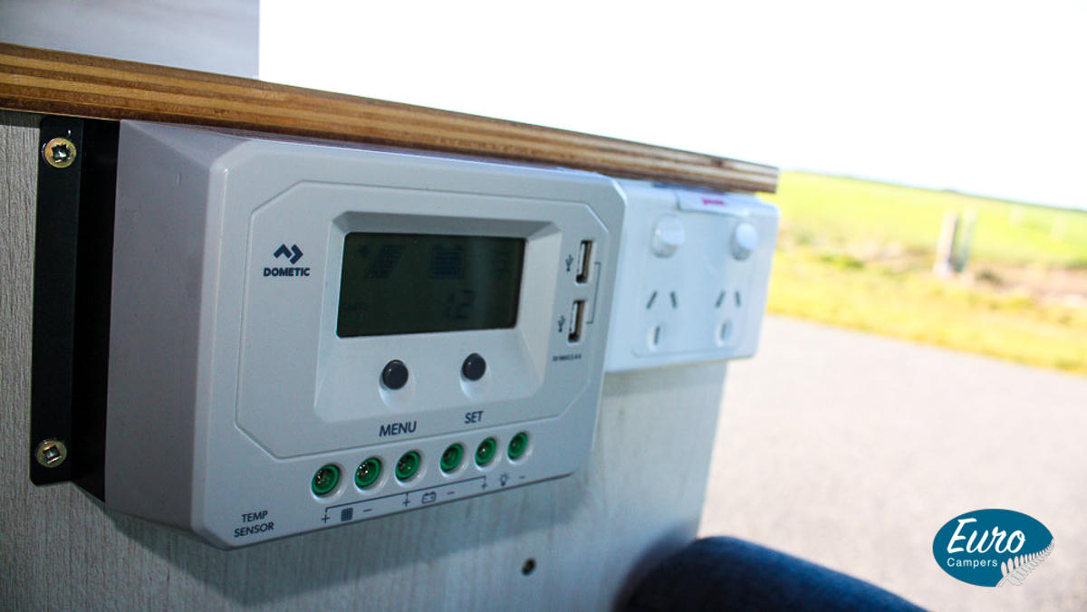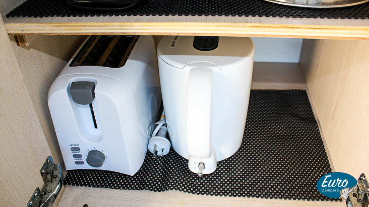 Der Innenausbau wurde 2019 gefertigt und bietet eine solide Ausstattung für ein unabhängiges Abenteuer durch Neuseeland. In der Küche kann dank einer Innenhöhe von 1,95m bequem gekocht werden. Dazu steht ein 2-flammiger Gasherd zur Verfügung. Außerdem stehen Geräte wie Wasserkocher und Toaster (jeweils bei 240V) sowie ausreichend Geschirr und Kochutensilien zur Verfügung. Der Kühlschrank fasst 60L und besitzt ein Gefrierfach. Die Wohnraumbatterie wird von einer Solaranlage auf dem Dach unterstützt. Außerdem ist im vorderen Wohnbereich eine tragbare Toilette verstaut, dank welcher der Euro Sky 3 self-contained zertifiziert ist. Hinzu kommt eine Solar Dusche für den Außenbereich. Somit steht dem günstigen Freedom Camping nichts im Weg.