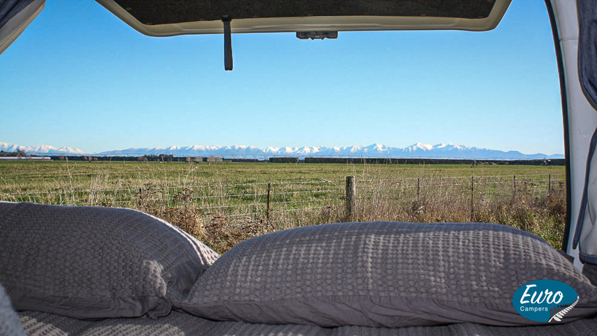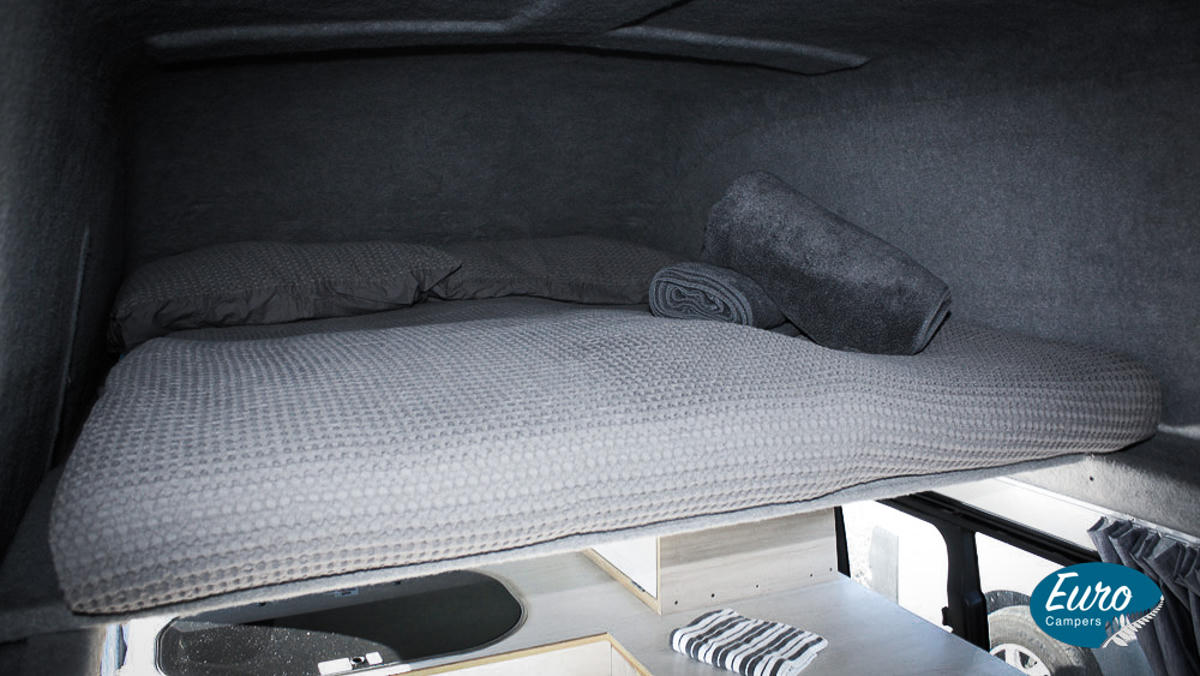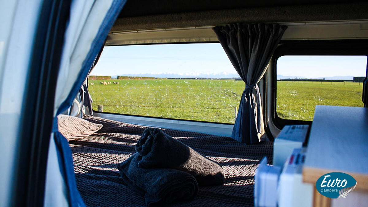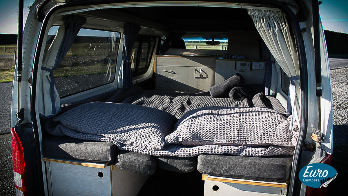 Im oberen Fahrzeugbereich des Hitops befindet sich ein stabiles, relativ großes Einzelbett (1,80m x 1,40m, keine Gewichtsbeschränkung). in absoluter Pluspunkt für Familien ist hier das Sicherheitsnetz, sodass auch kleinere Kinder unbedenklich oben schlafen können. Unten im Heck des Euro Sky 3 entsteht aus der Sitzecke nach kurzem Umbau ein geräumiges Doppelbett (1,70 x 1,90m). Bei geöffneten Flügeltüren am Heck kann somit sowohl von der Sitzecke als auch aus dem Bett die Schönheit der Landschaft Neuseelands genossen werden. Praktisch sind zudem die größeren Staufächer unter den Sitzbänken. Obwohl es einige Staumöglichkeiten für Ausrüstung und Gepäck gibt, wird zu Rucksäcken und weichen Reisetaschen geraden.