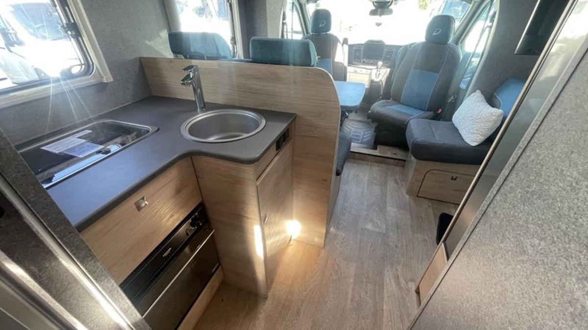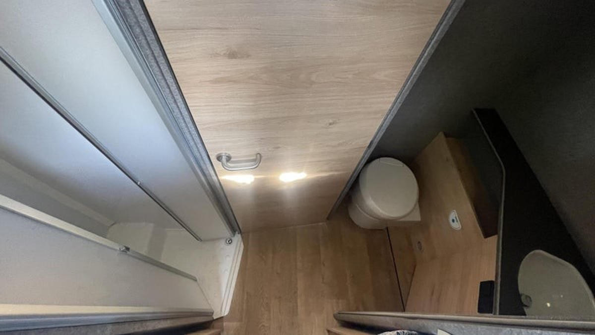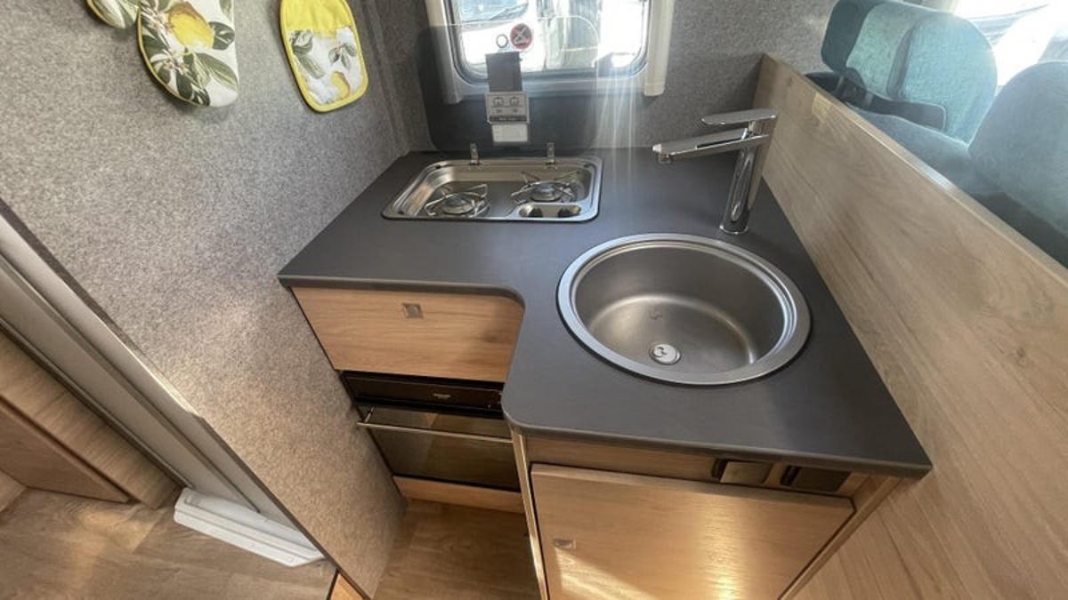 Die Küche ist mit einem 2-Flammen-Gaskocher, einem Backofen und einem 142-Liter-Kühl- und Gefrierschrank ausgestattet. An Bord sind ein 115-Liter-Frischwassertank und ein 95-Liter-Abwassertank. Das Bad ist ausgestattet mit einer Dusche, einer Toilette sowie einem Waschbecken.