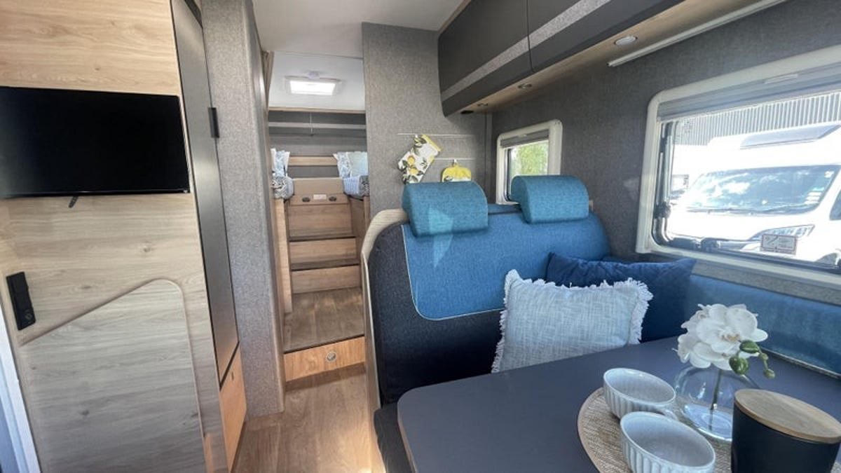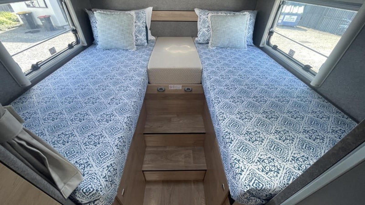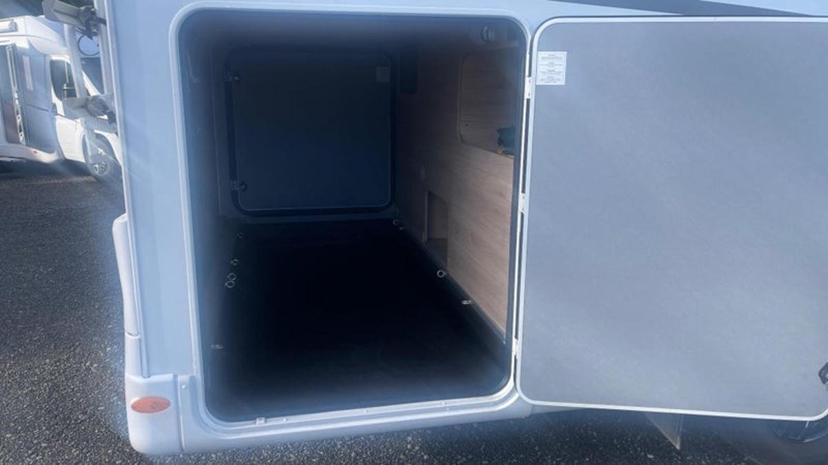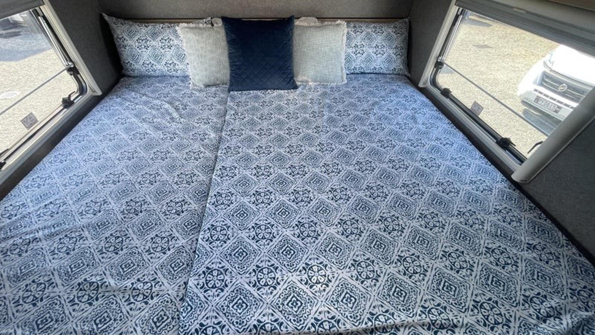 Im Heck befinden sich zwei Einzelbetten, die sich zu einem großen Doppelbett verbinden lassen. Zusätzlich kann die vordere Sitzgruppe in einen zweiten Schlafbereich umgebaut werden, sodass bis zu 4 Personen Platz finden. Unter den Betten bietet die Heckgarage (115 x 95 cm) genug Raum, um Fahrräder sicher zu verstauen.