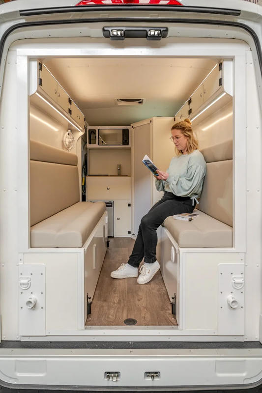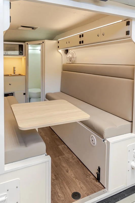 Im Inneren überzeugt der MAD2+ mit einer durchdachten Aufteilung und viel Bewegungsfreiheit – dank einer Stehhöhe von 1,90 m. Die Sitzbänke lassen sich einfach zu einem fast Queen-Size-Bett (1,90 m x 1,60 m) umfunktionieren, sodass ihr nachts bequem schlafen könnt. Für zusätzliche Privatsphäre sorgen Vorhänge an allen Fenstern.