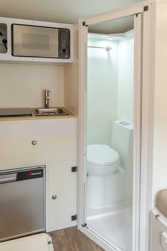 Die Küche ist vollständig ausgestattet und bietet alles, was ihr zum Kochen braucht: Induktionskochfeld, Mikrowelle, 25-Liter-Kühlschrank, Spüle sowie 70-Liter-Frischwassertank und Warm- und Kaltwasser. Salz, Pfeffer, Öl, Geschirr, Töpfe, Pfannen, Besteck, Handtücher und Bettwäsche sind bereits an Bord – perfekt für den Start ins Abenteuer.
