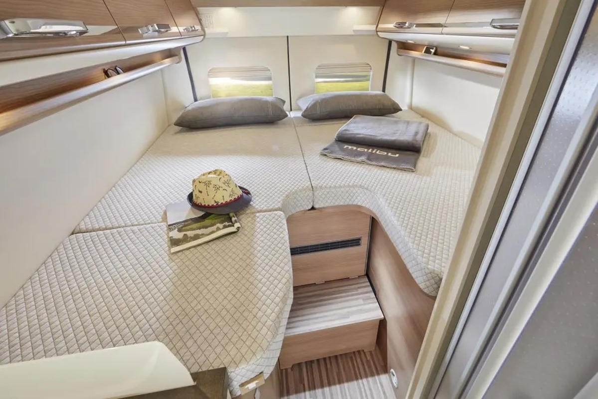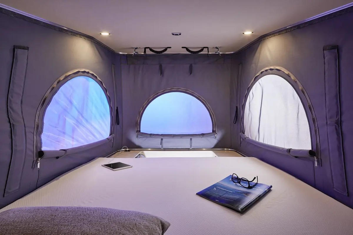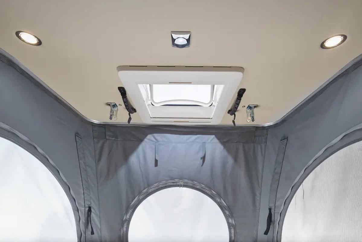 Einer der größten Vorteile: Die Betten müssen nicht täglich umgebaut werden. Im Heck befinden sich zwei feste Einzelbetten, die sich bei Bedarf zu einem großen Doppelbett verbinden lassen. Zusätzlich bietet das aufklappbare Dachzelt ein zweites, vollwertiges Doppelbett – inklusive USB-Ladepunkten und Skylight für nächtliche Ausblicke. Beide Schlafbereiche sind permanent nutzbar, jederzeit bereit – kein Umklappen, kein Verstauen, kein Aufwand.