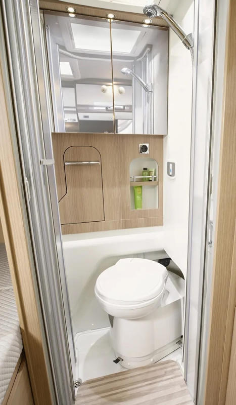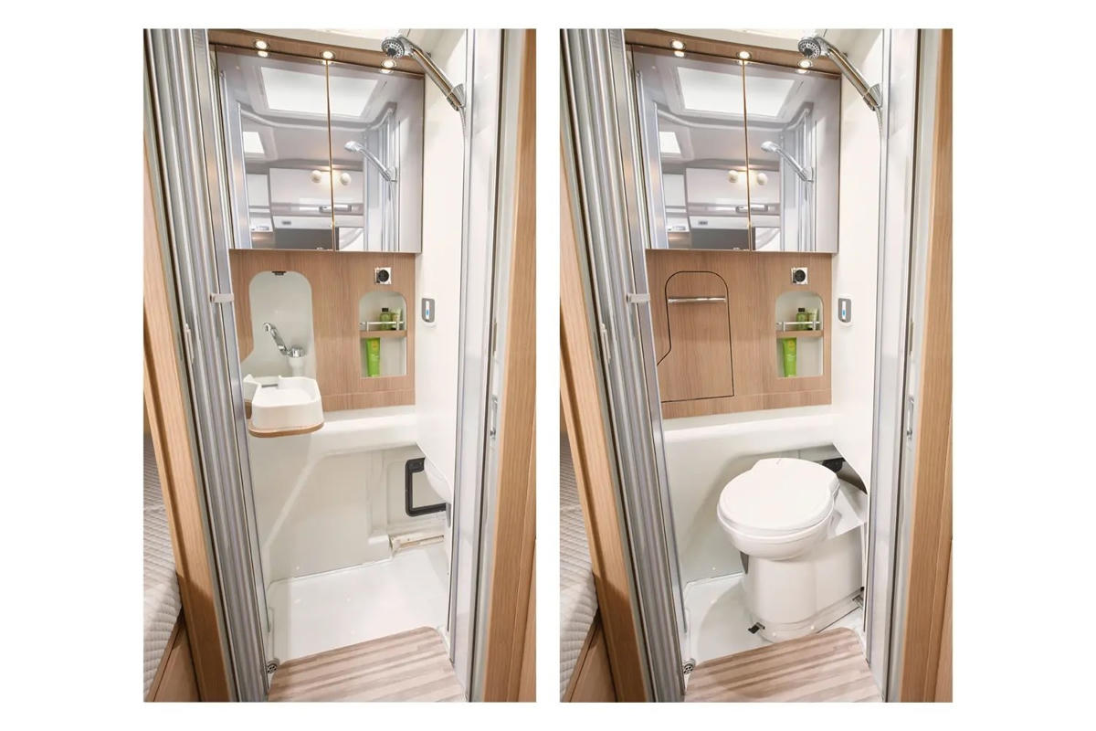 Das Badezimmer ist komfortabler gestaltet als in vielen vergleichbaren Campern: ein herunterklappbares Waschbecken, eine schwenkbare Toilette und eine große, separate Duschkabine mit fester Tür sorgen für deutlich mehr Platz und Komfort als herkömmliche Nasszellen.