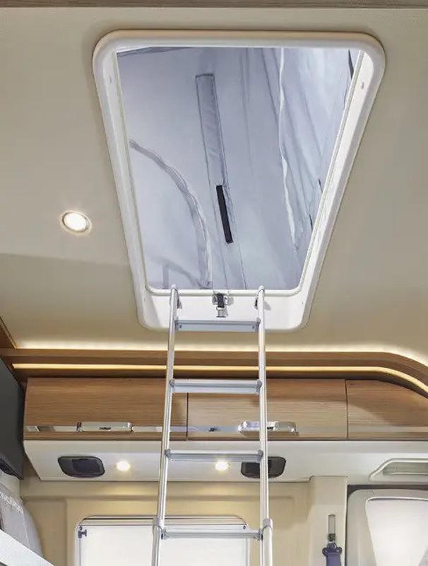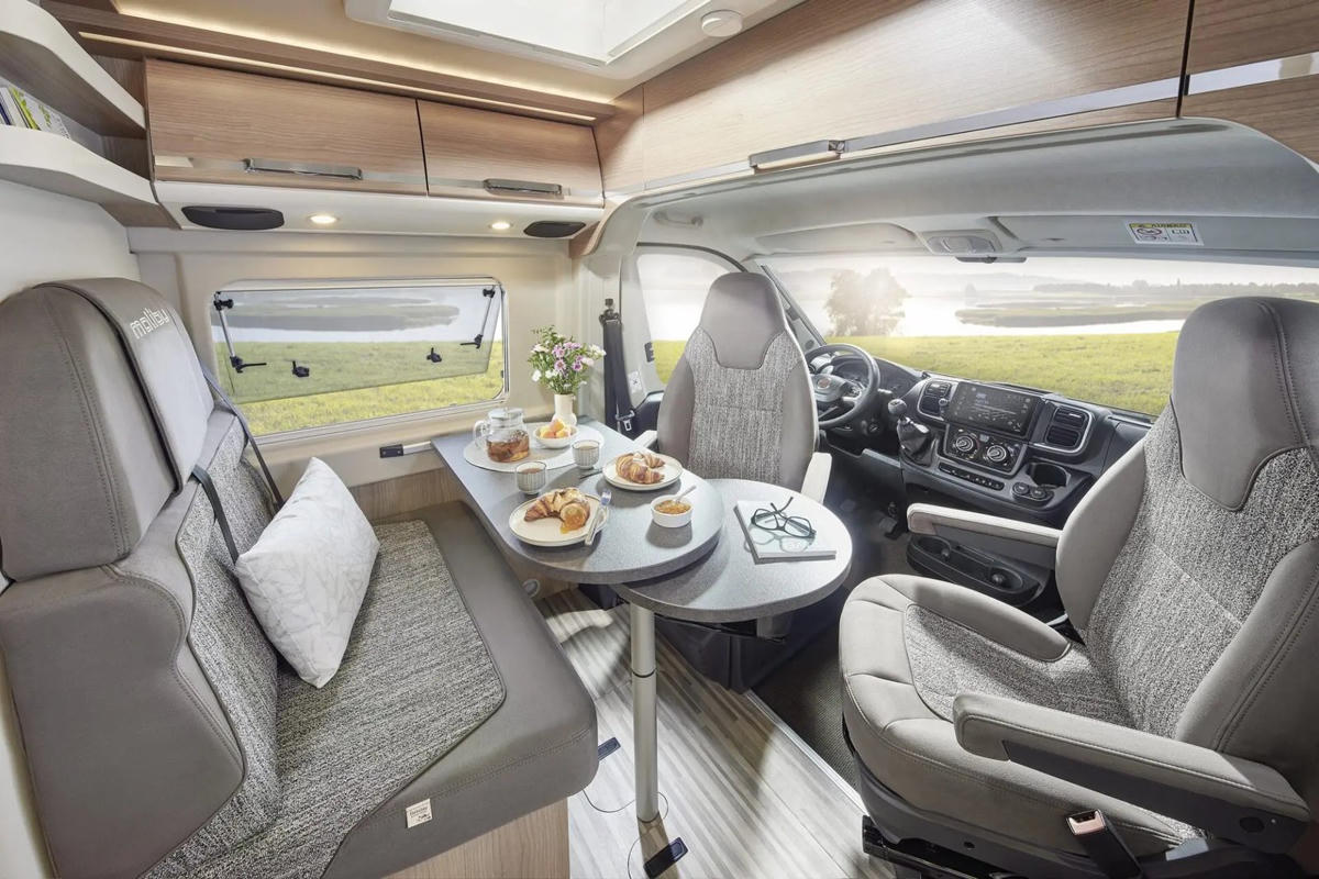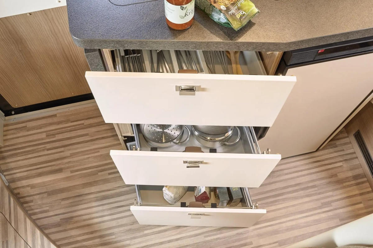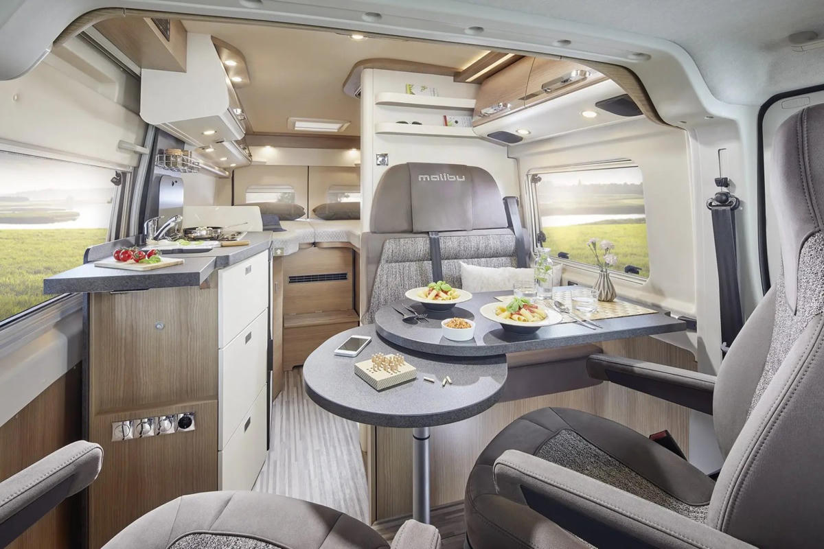 Im Innenraum erwartet dich eine gut durchdachte Küche mit Gasherd, einem 84-Liter-Kühlschrank mit Gefrierfach, einer Arbeitsplattenverlängerung sowie reichlich Stauraum für Kochutensilien. Die drehbaren Vordersitze und der erweiterbare Esstisch schaffen einen gemütlichen Wohn- und Essbereich.