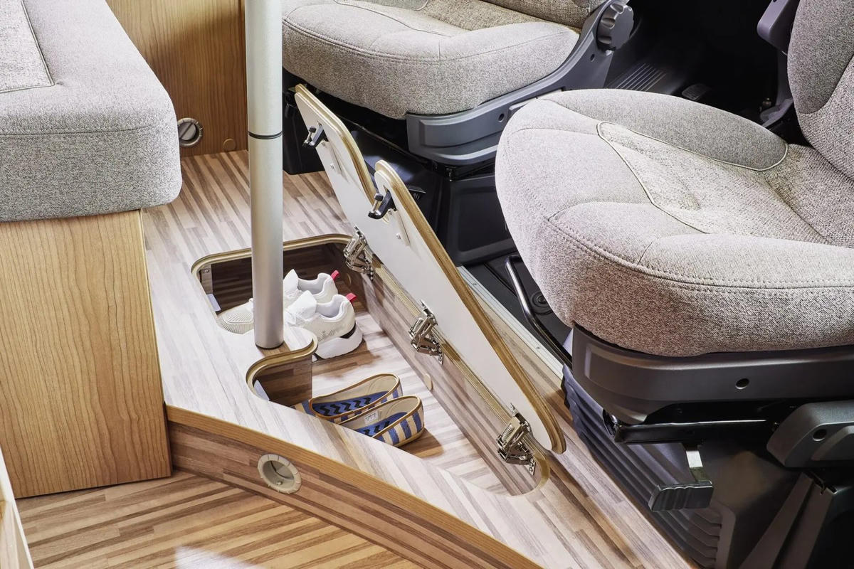 Für autarkes Reisen ist der Comfort bestens ausgestattet. Dazu gehören ein 100-Liter-Frischwassertank, ein 92-Liter-Grauwassertank, Kassettentoilette, Solaranlage zur Ladung der Freizeitbatterie sowie Gasbetrieb für Kochen und Warmwasser. Unter dem Bett und im Bodenbereich befinden sich clevere Stauräume und versteckte Fächer, die von innen und außen zugänglich sind – perfekt für Schuhe, Gepäck oder Ausrüstung.